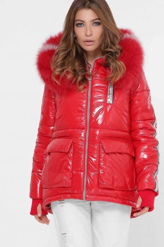 Очень красная блестящая куртка женская.