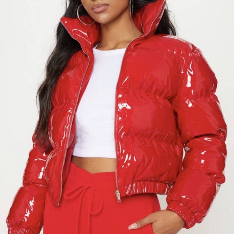 Очень красная лаковая куртка.