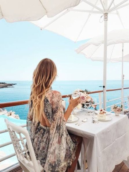 Красивая девушка в кафе у моря.