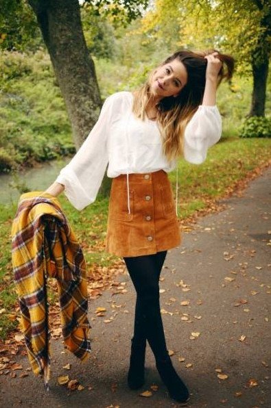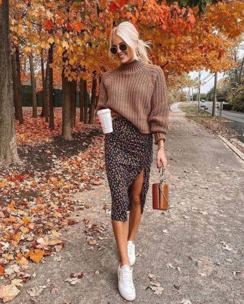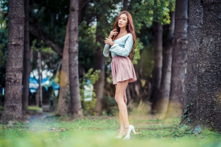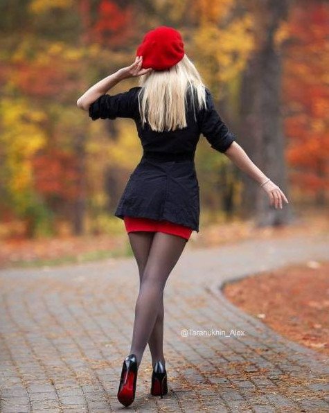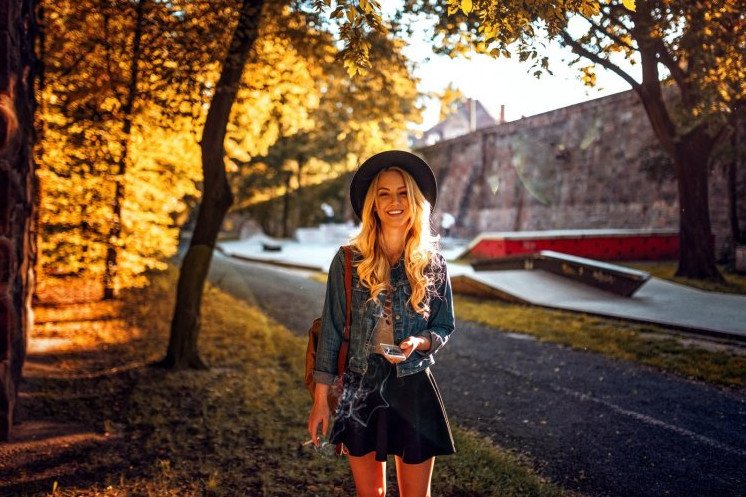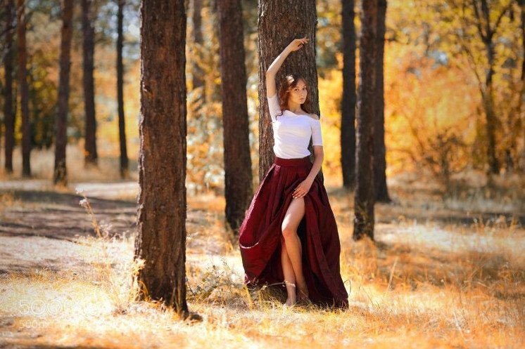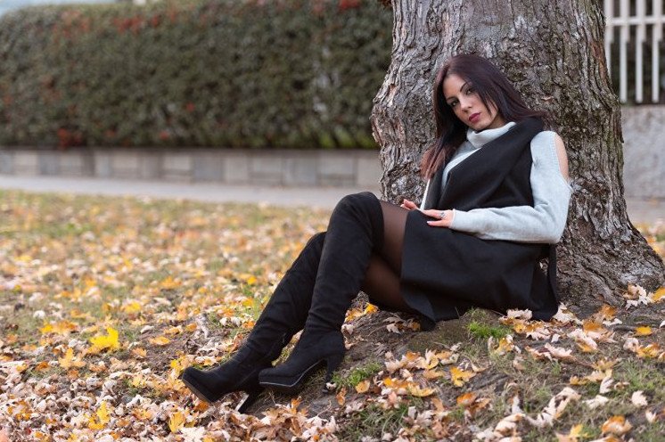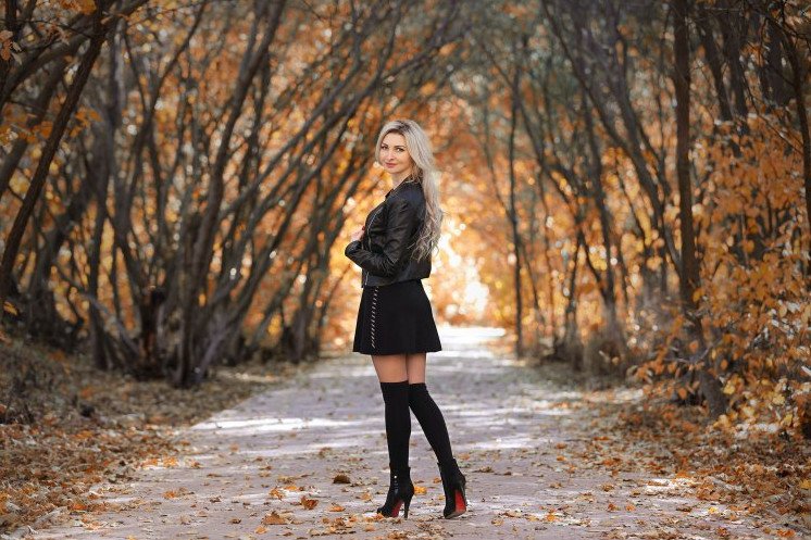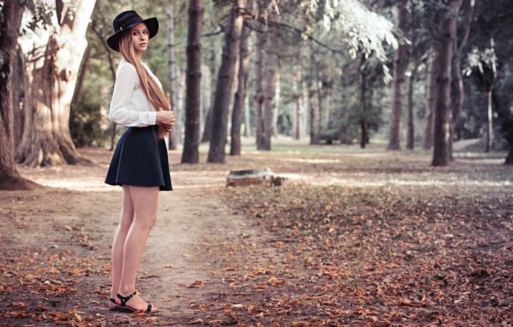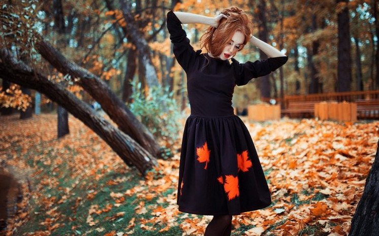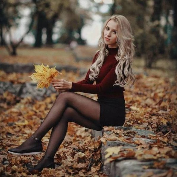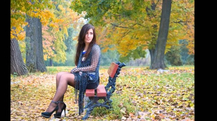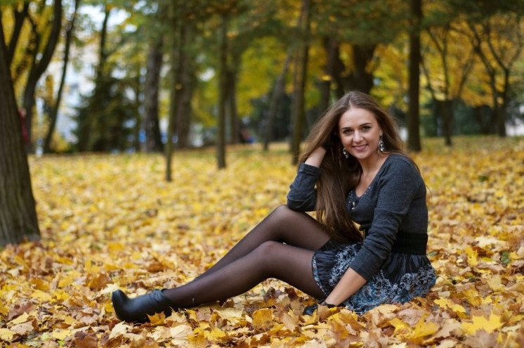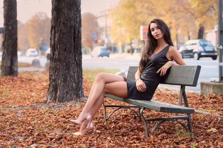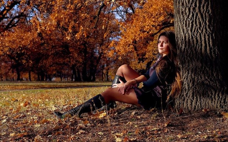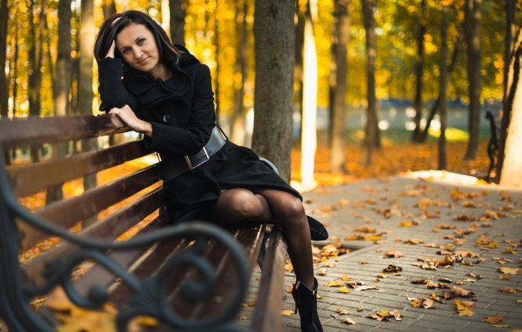Красивая девушка посиживает на лавке в парке в осеннюю пору.