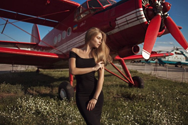 Девушка на фоне самолета.