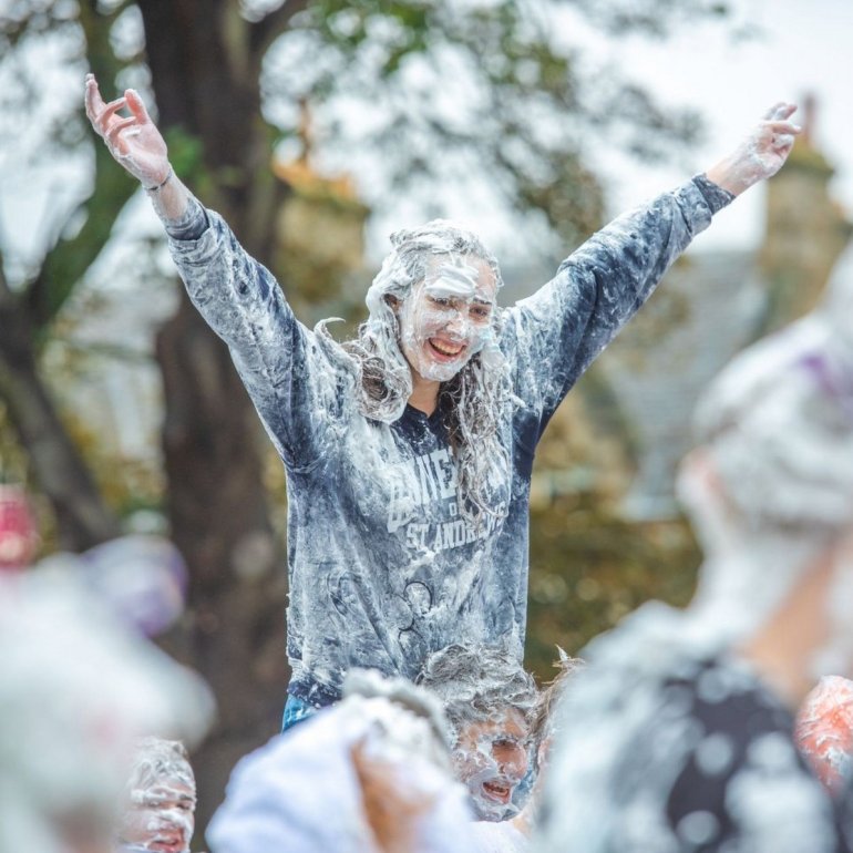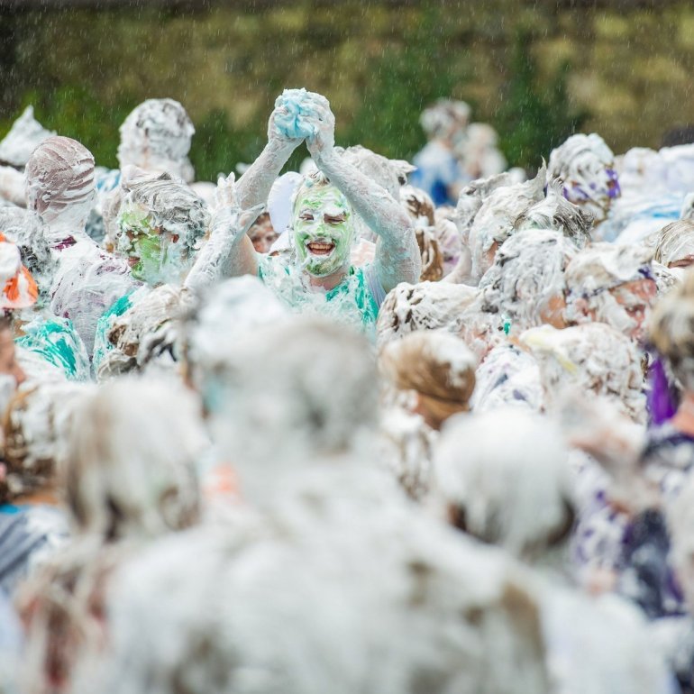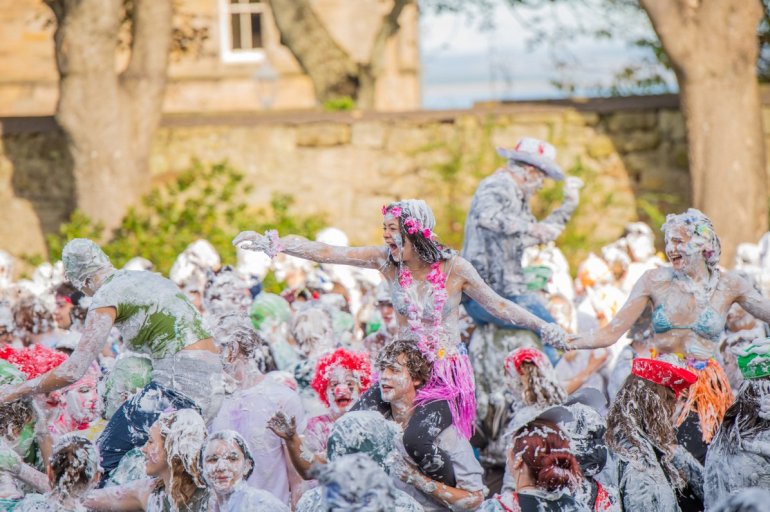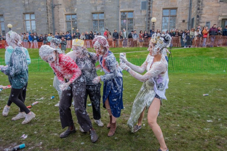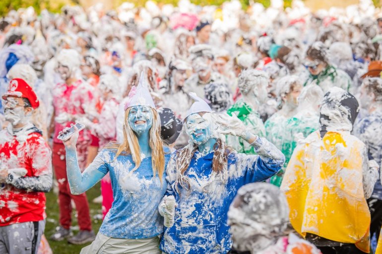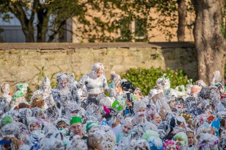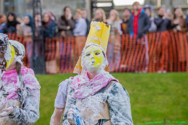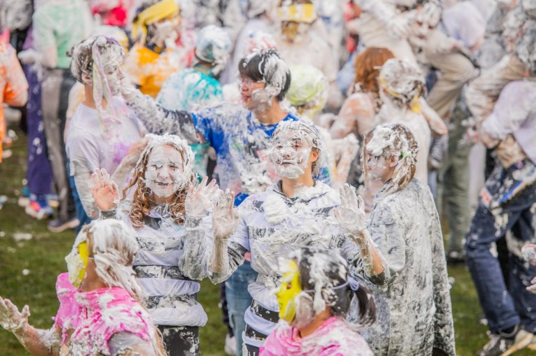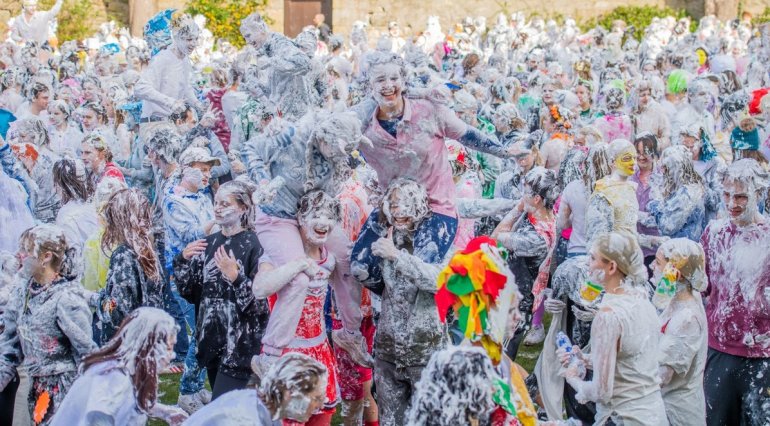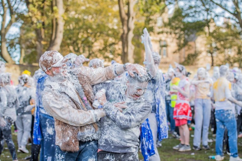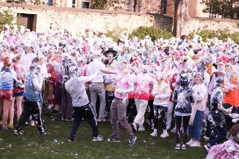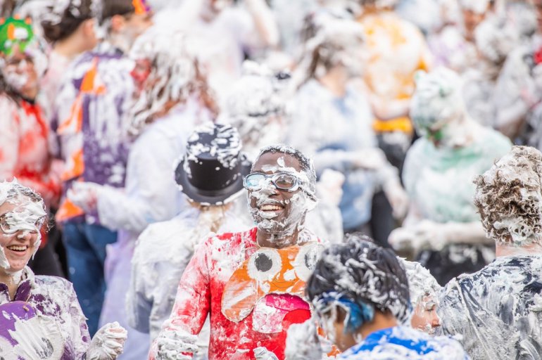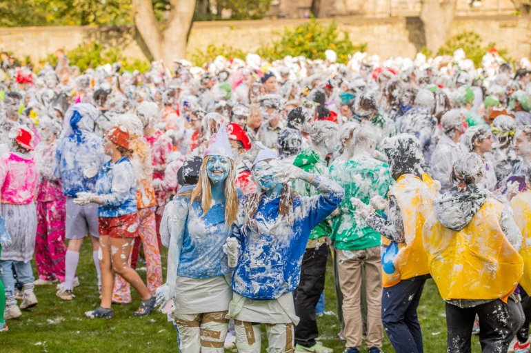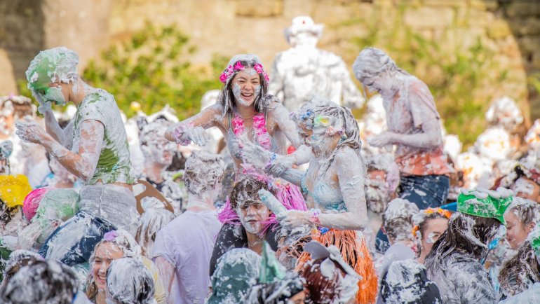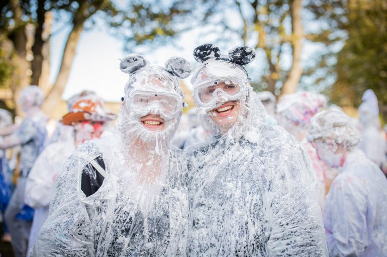 В этом году в "изюмный понедельник" "родители" нарядили своих детей-академиков и устроили пенную битву на университетской лужайке.