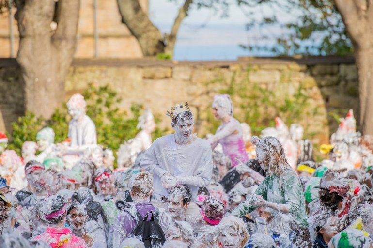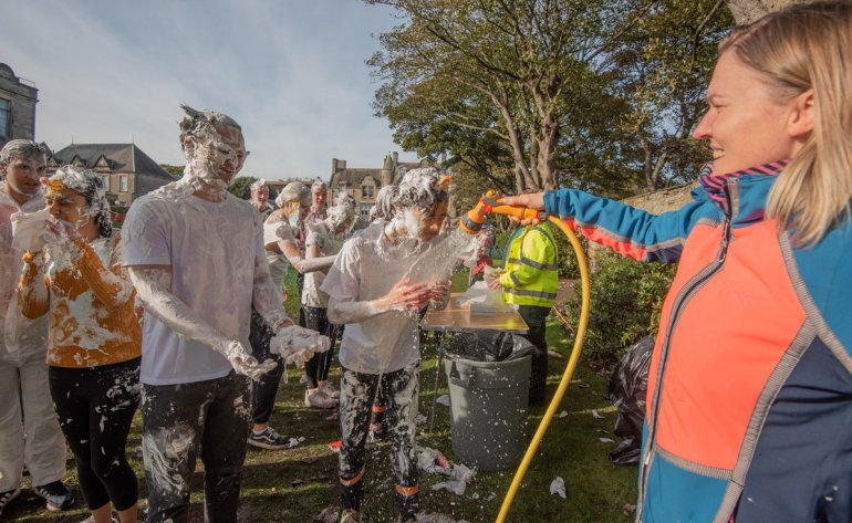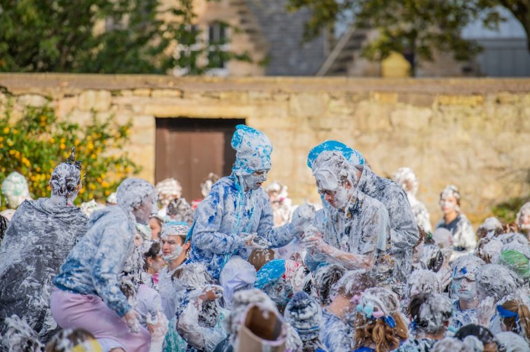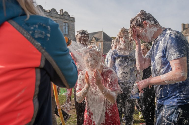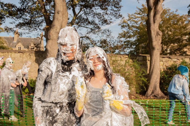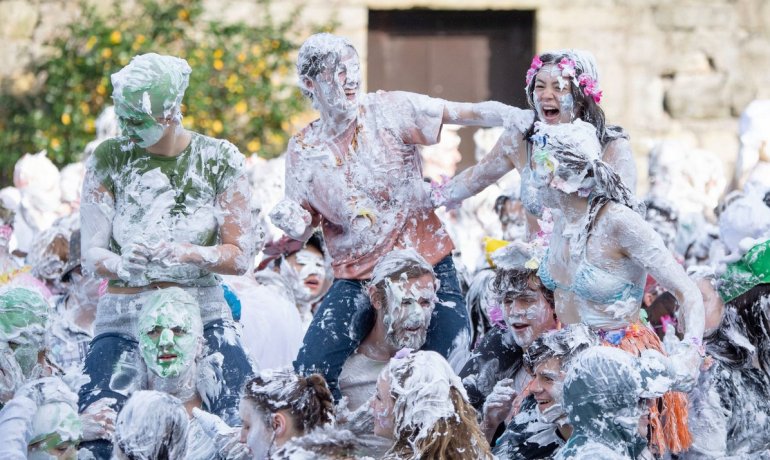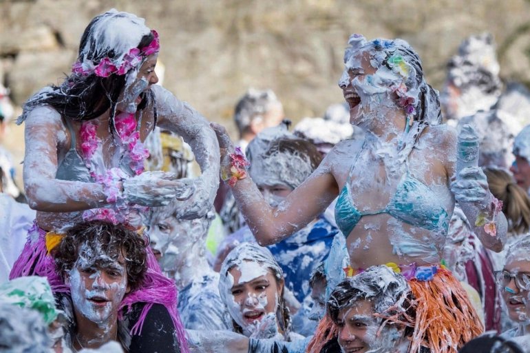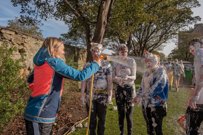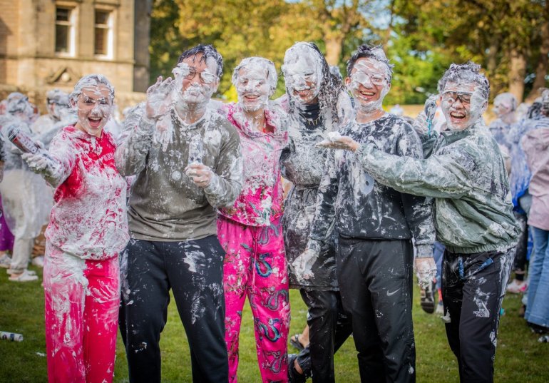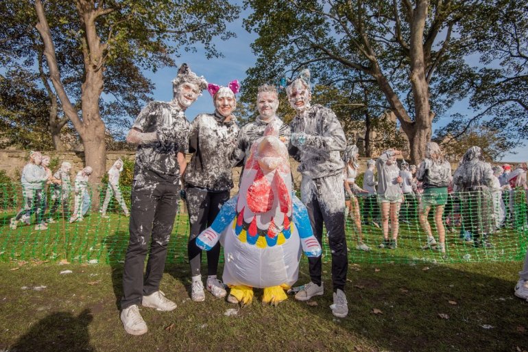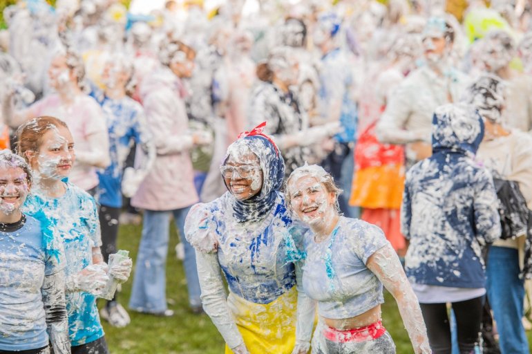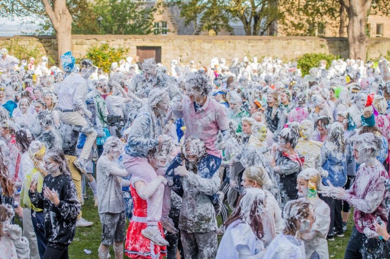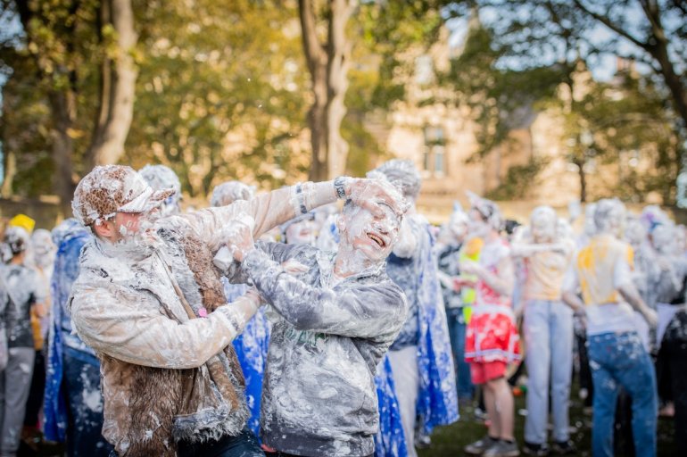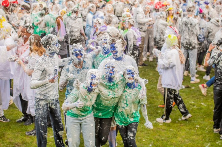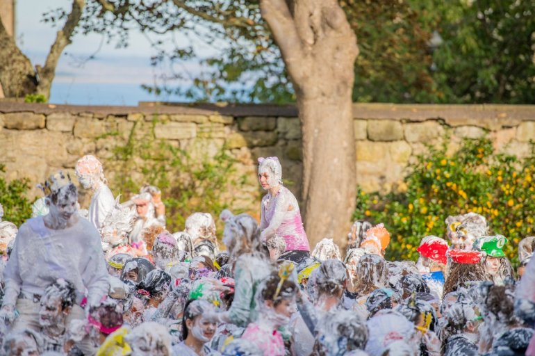 В этом году в "изюмный понедельник" "родители" нарядили своих детей-академиков и устроили пенную битву на университетской лужайке.