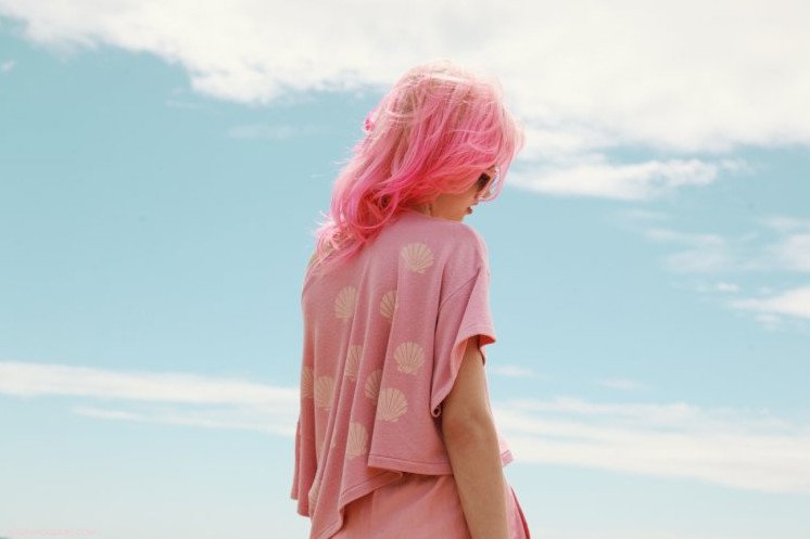 Девушка с розовыми волосами со спины.