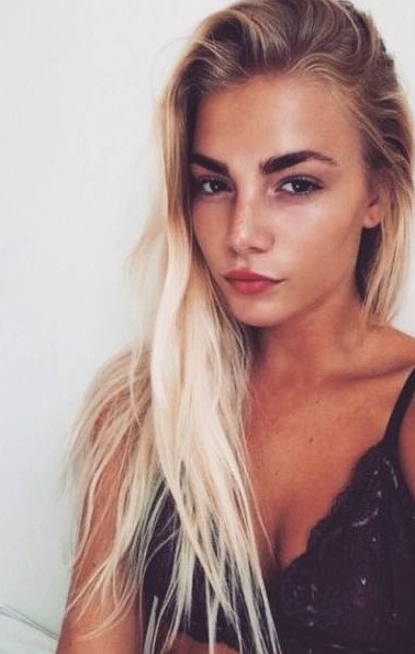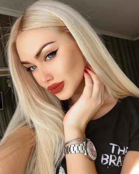 Блондиночка с темными бровями.