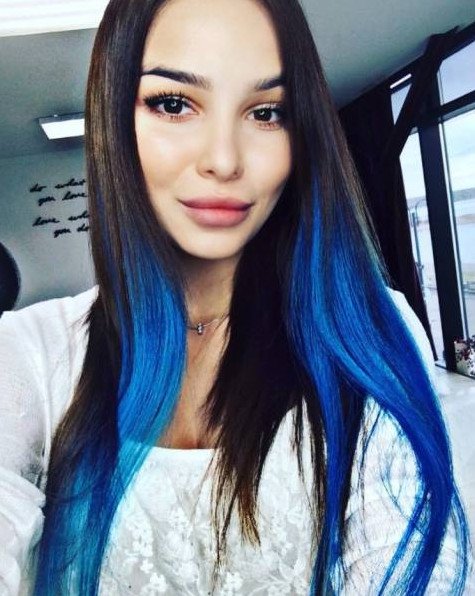Коричневые волосы с голубыми прядями.
