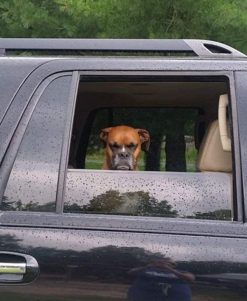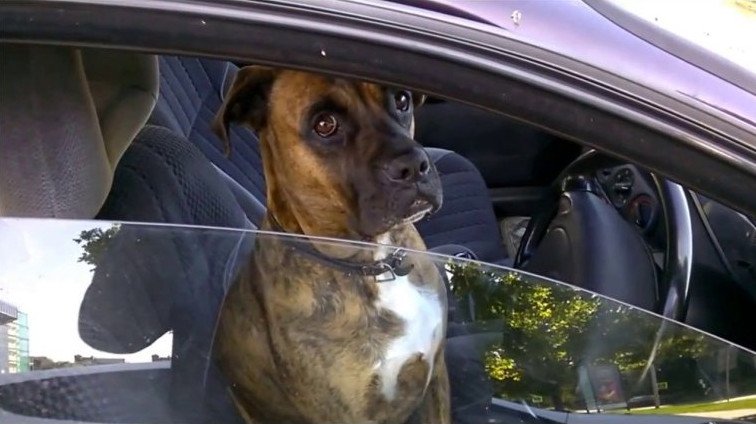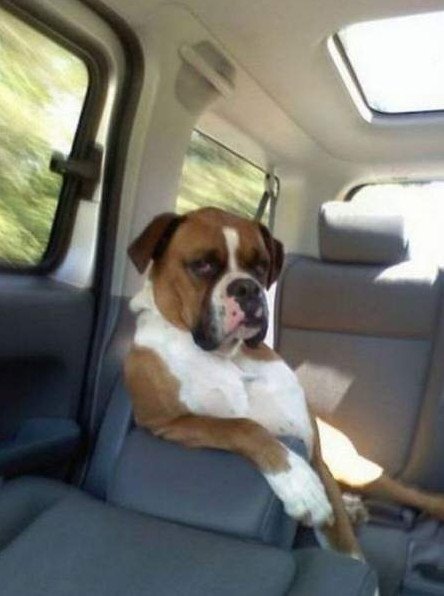 Собака боксер за рулем.
