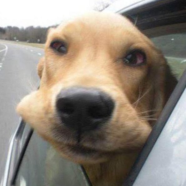 Собака из машины с языком.