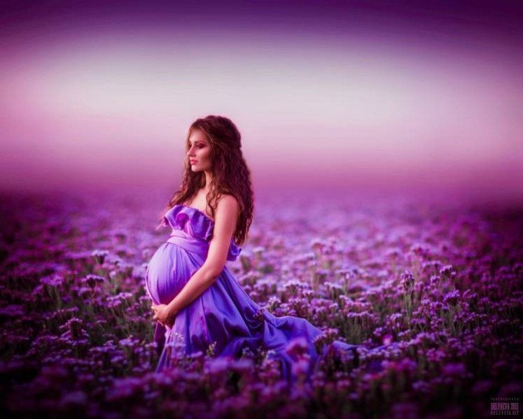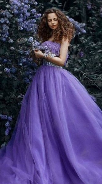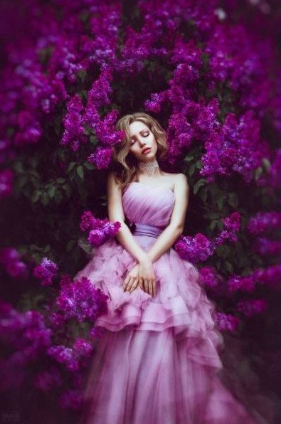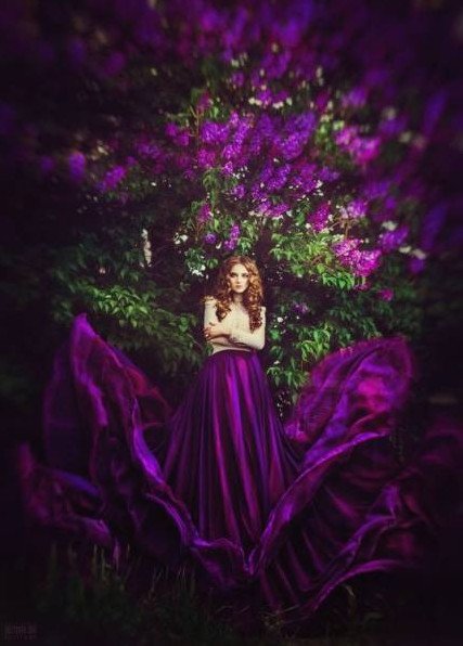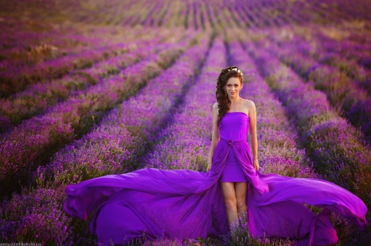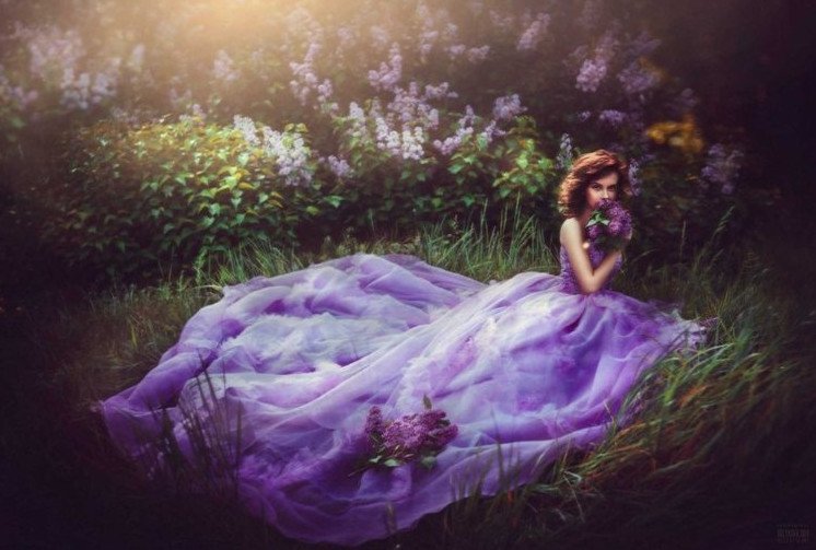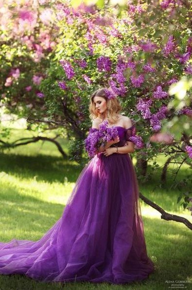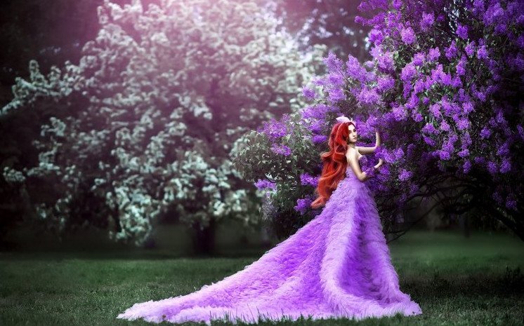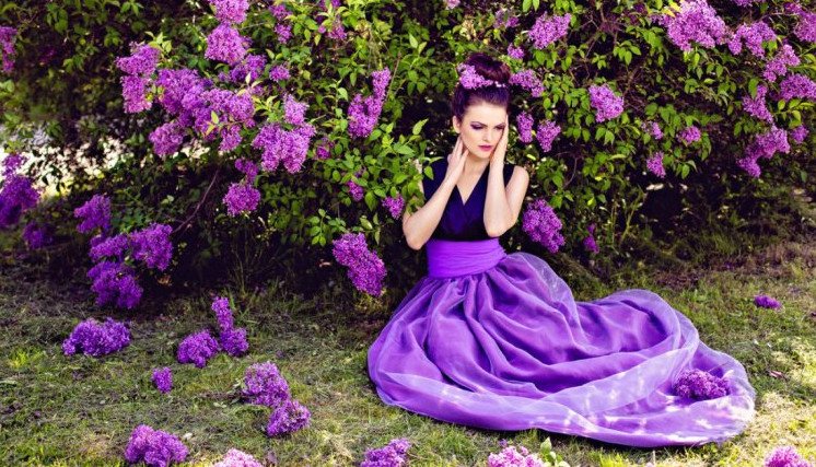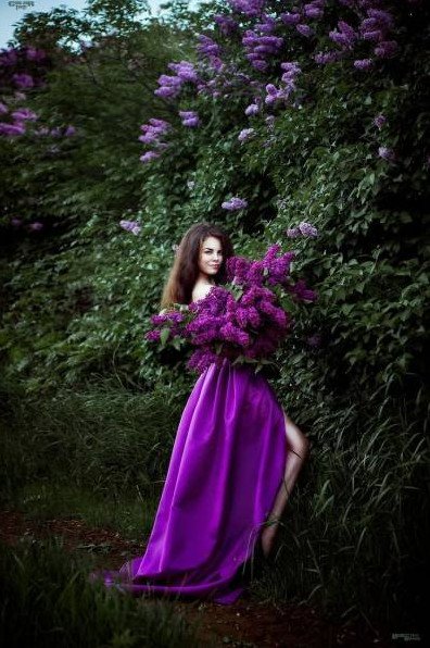 Прелестная прекрасная женщина на природе в сиреневом красивое платье.