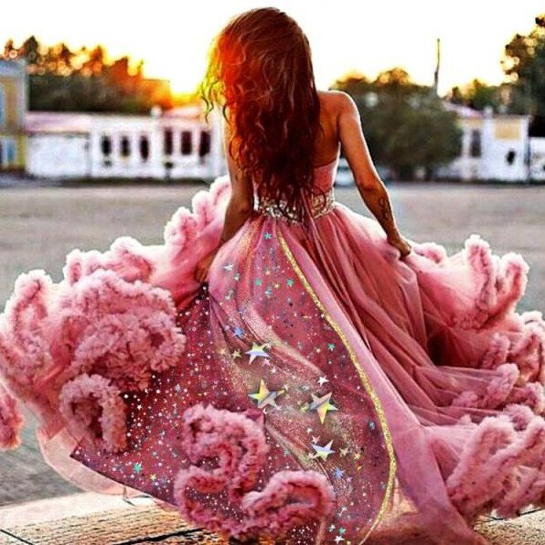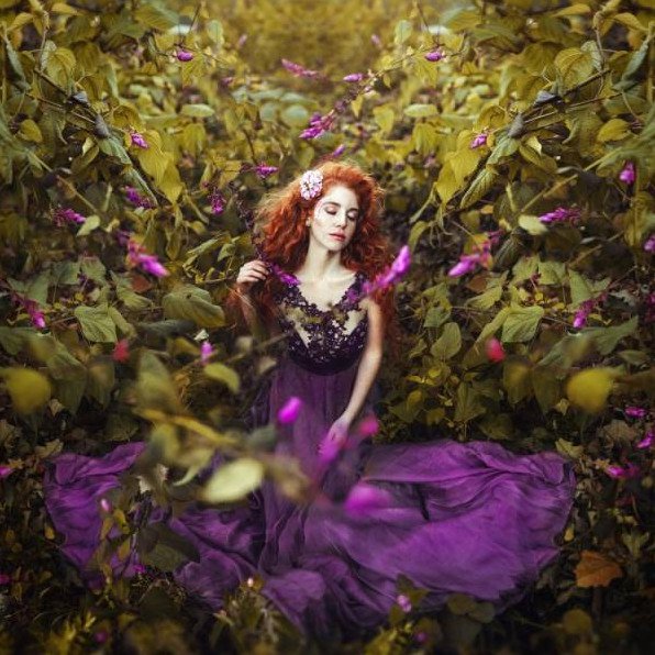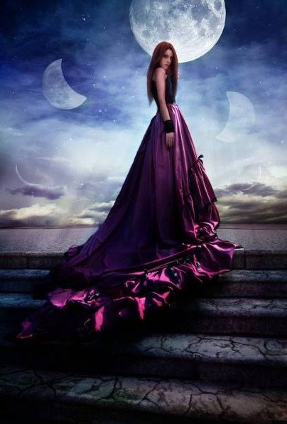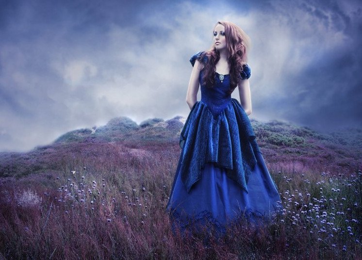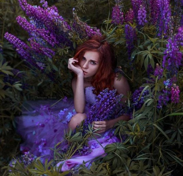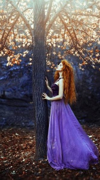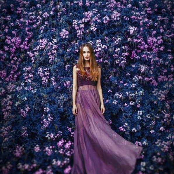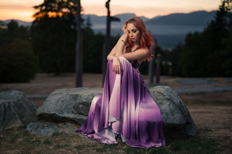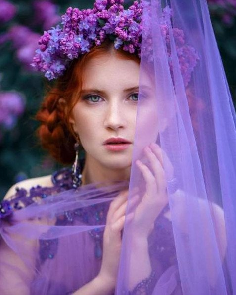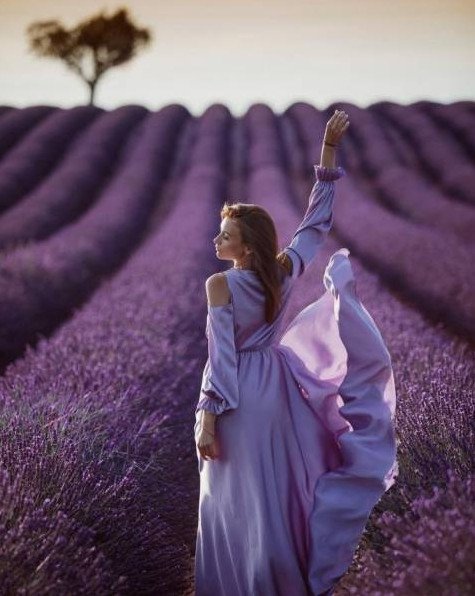 Прелестная прекрасная женщина на природе в сиреневом красивое платье.