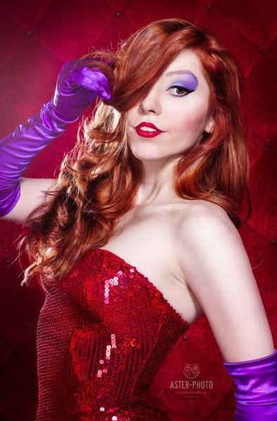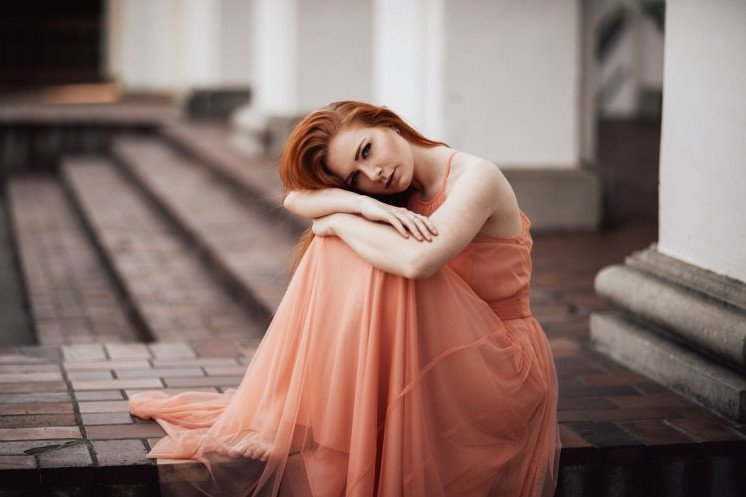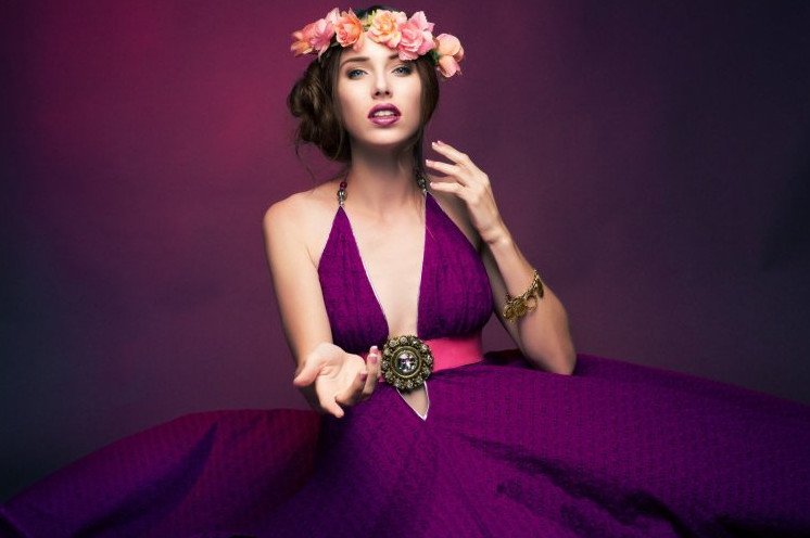 Эротика с брюнеткой в фиолетовом красивое платье.