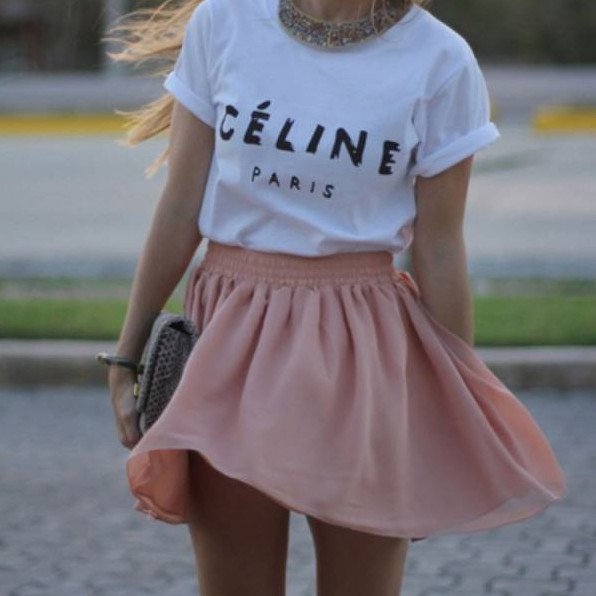 Красивая девушка в юбке и футболке.
