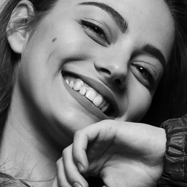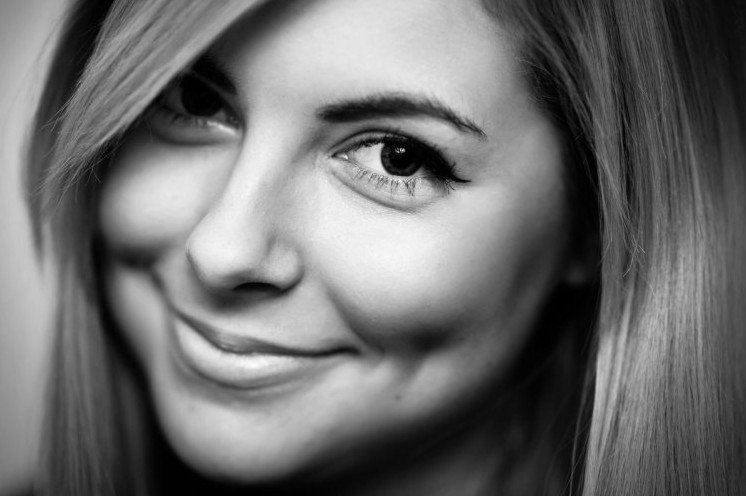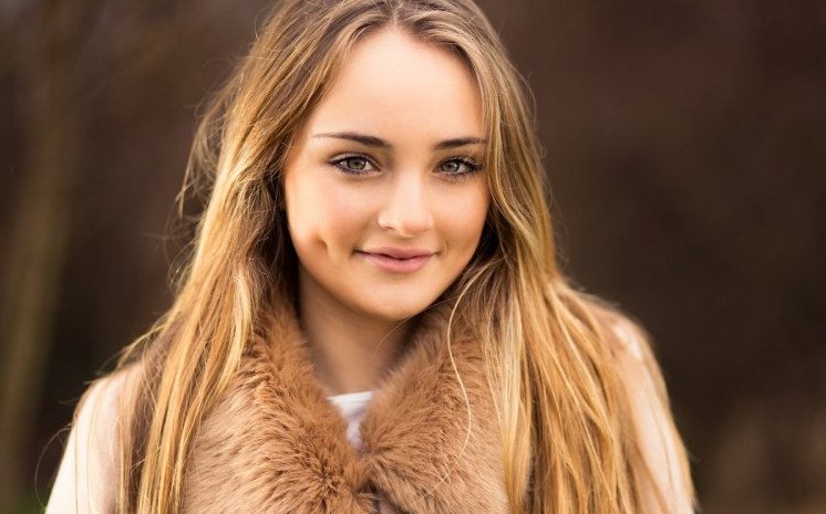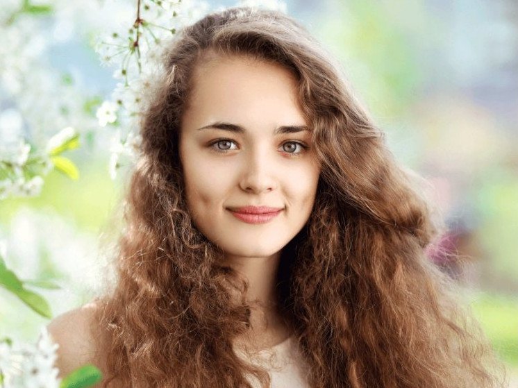 Прелестная красивая женщина с зелеными глазами и ямочками на щеках.