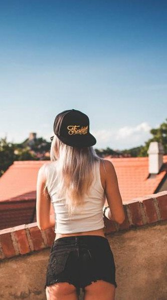 Блондиночка в бейсболке со спины.