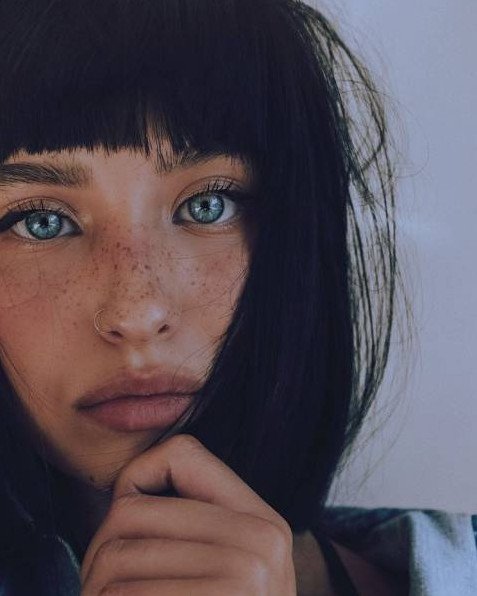 Черные волосы и веснушки.
