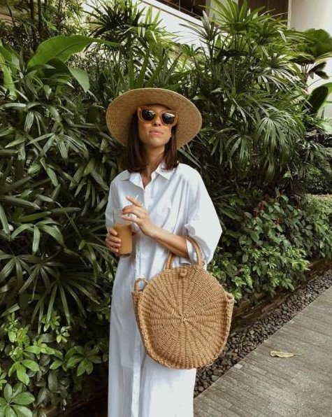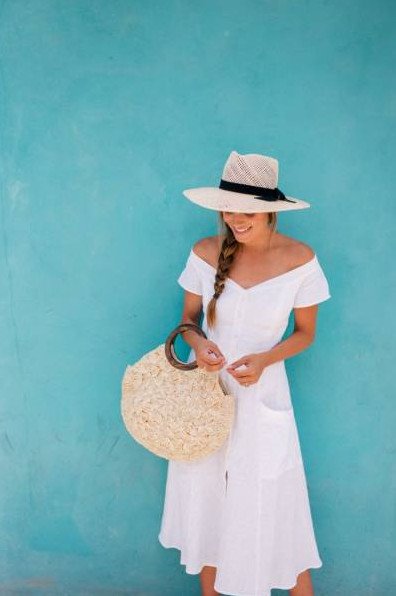 Белое прекрасное платье и соломенная шапка.