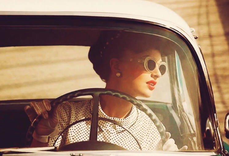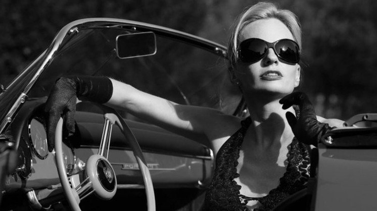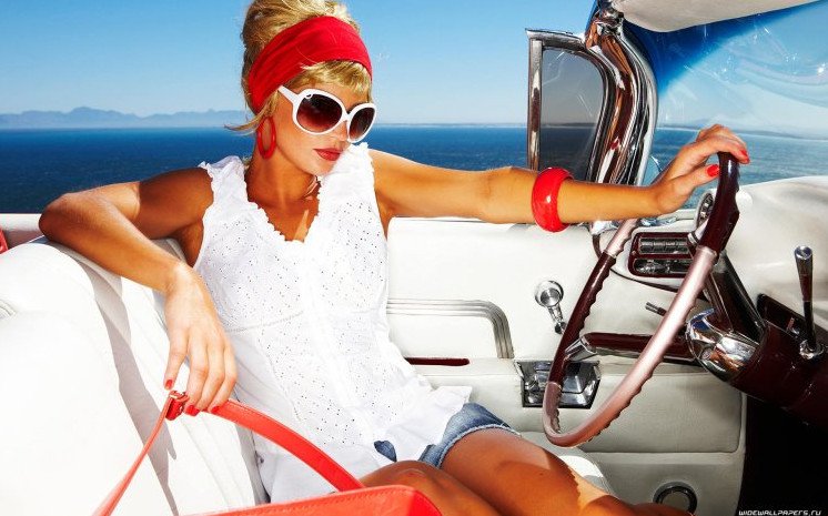 Девушка за рулем ретро кара.