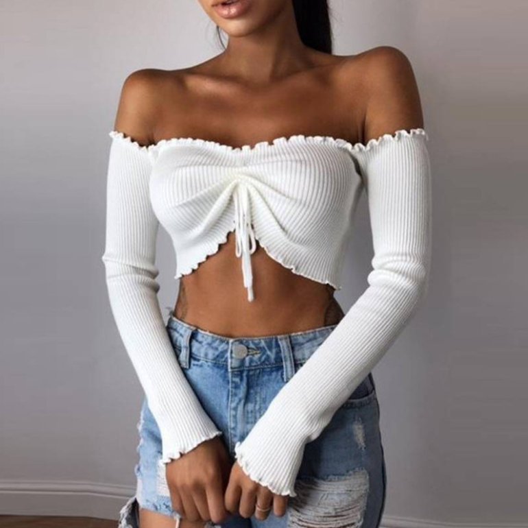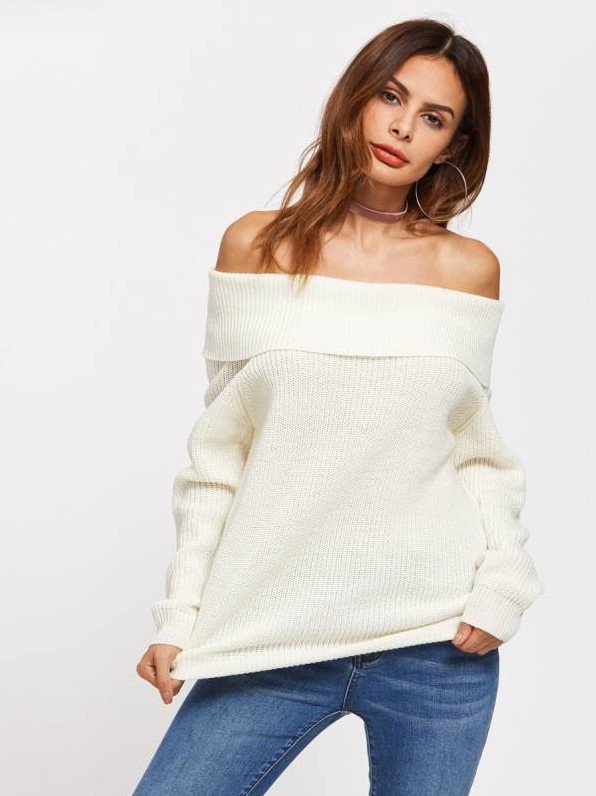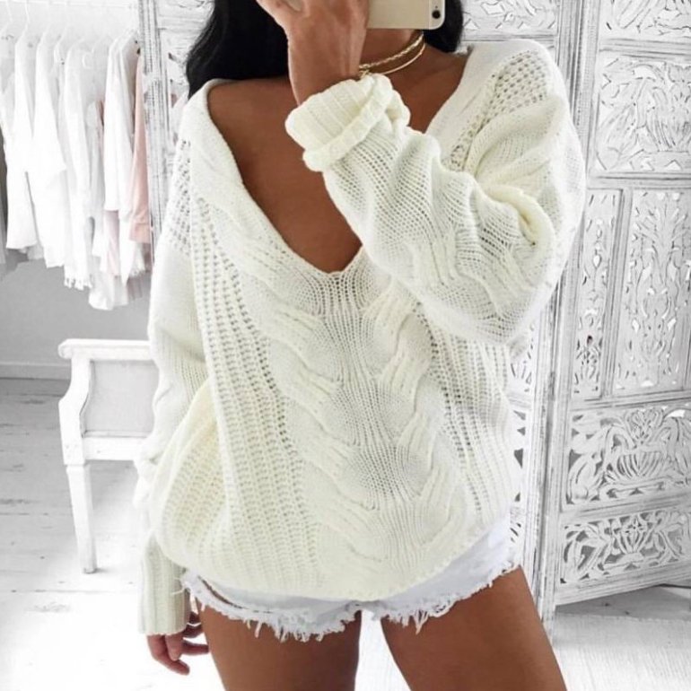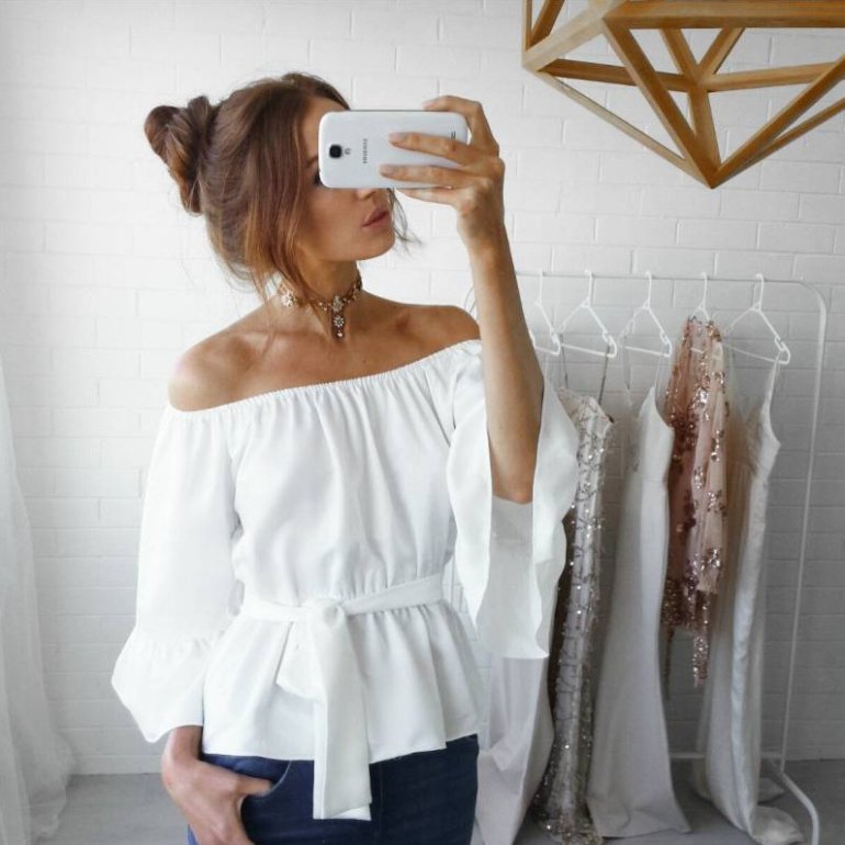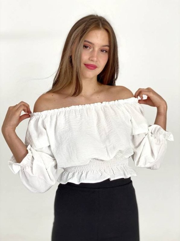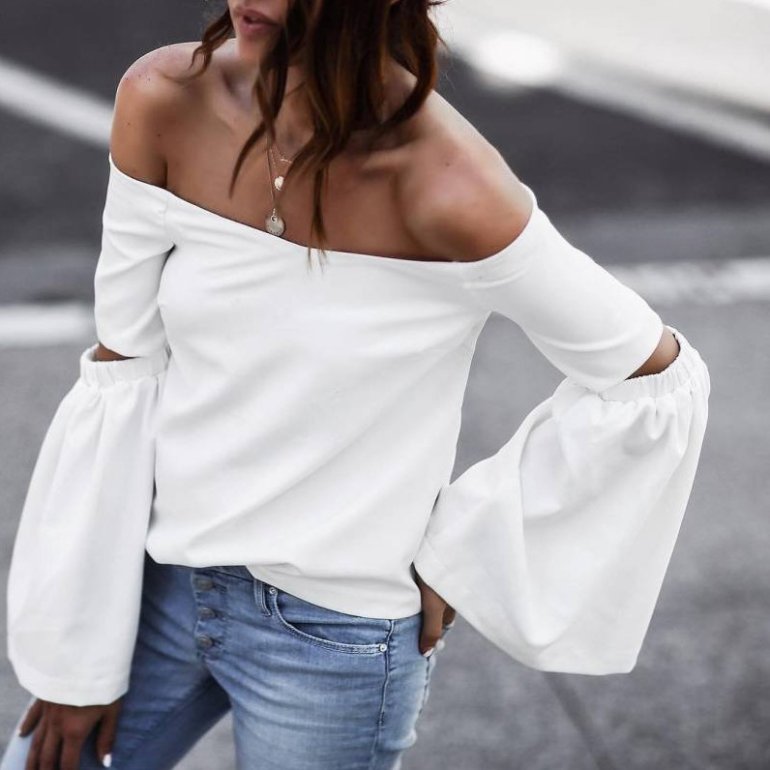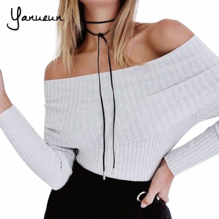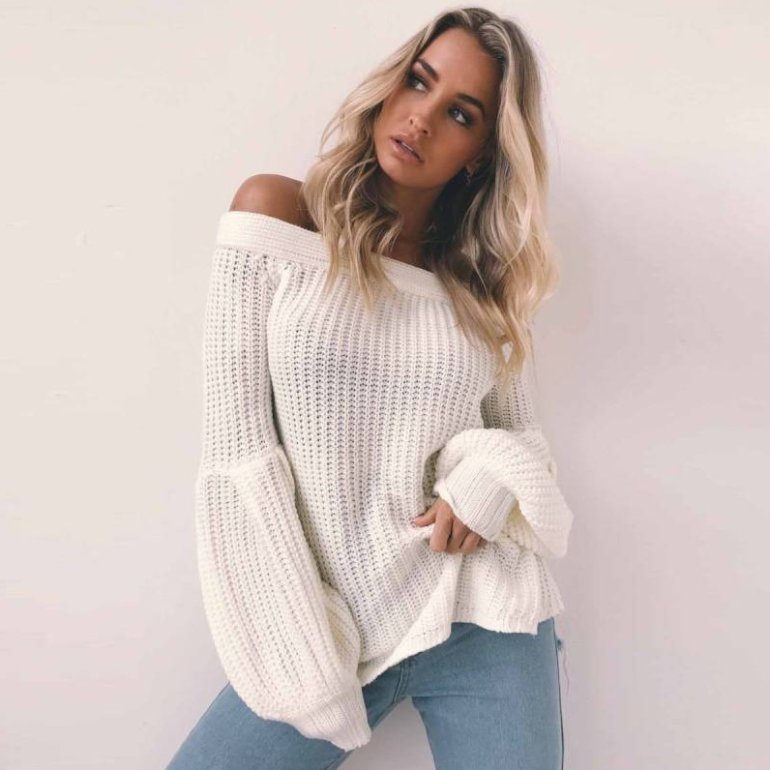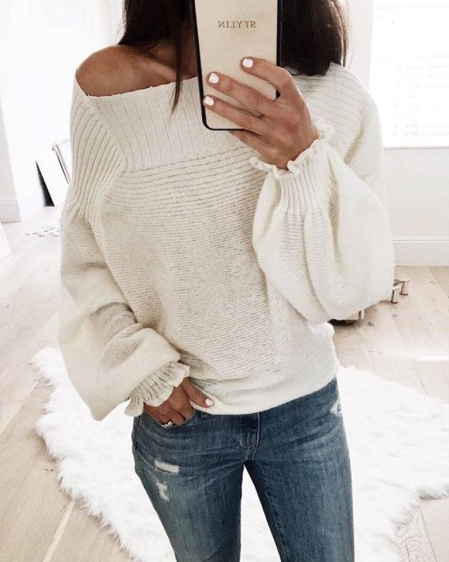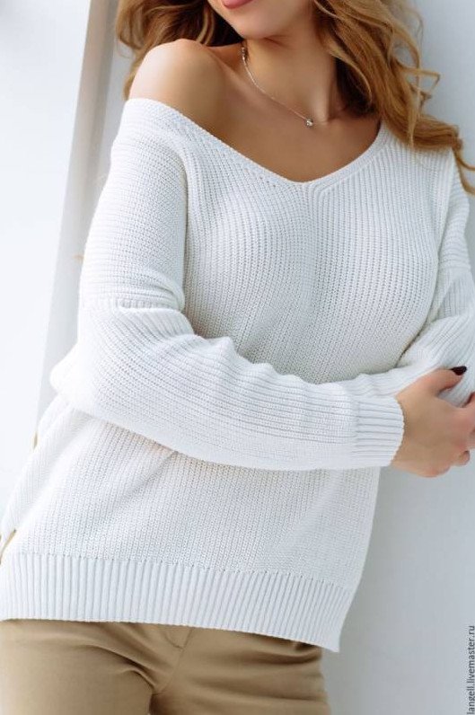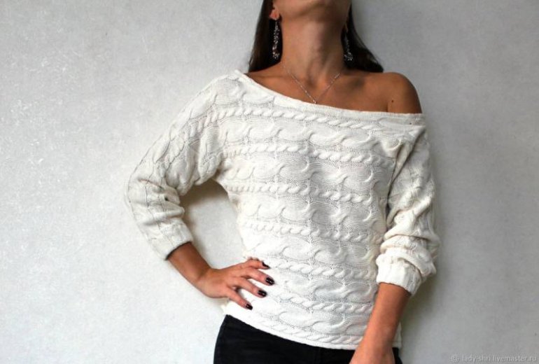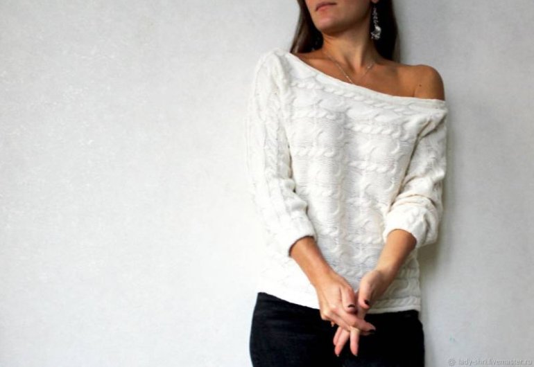 Кофта с открытыми плечами и длинноватыми рукавами.