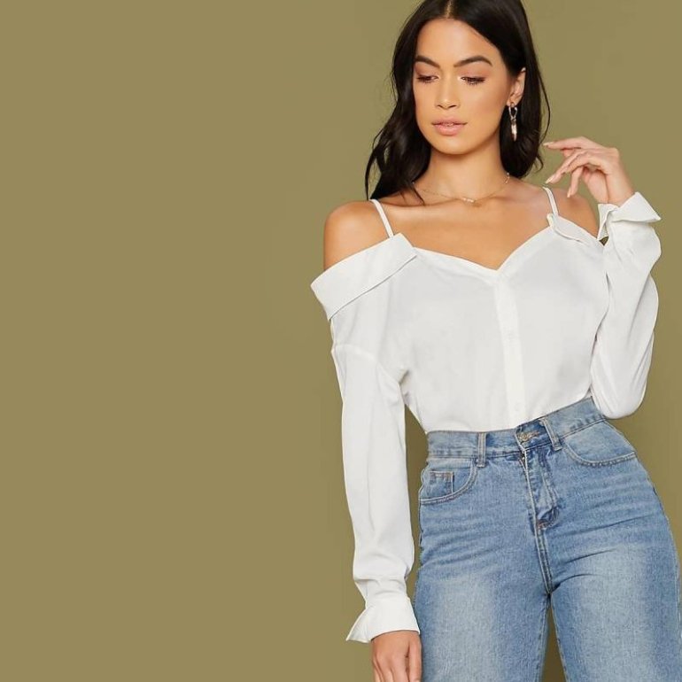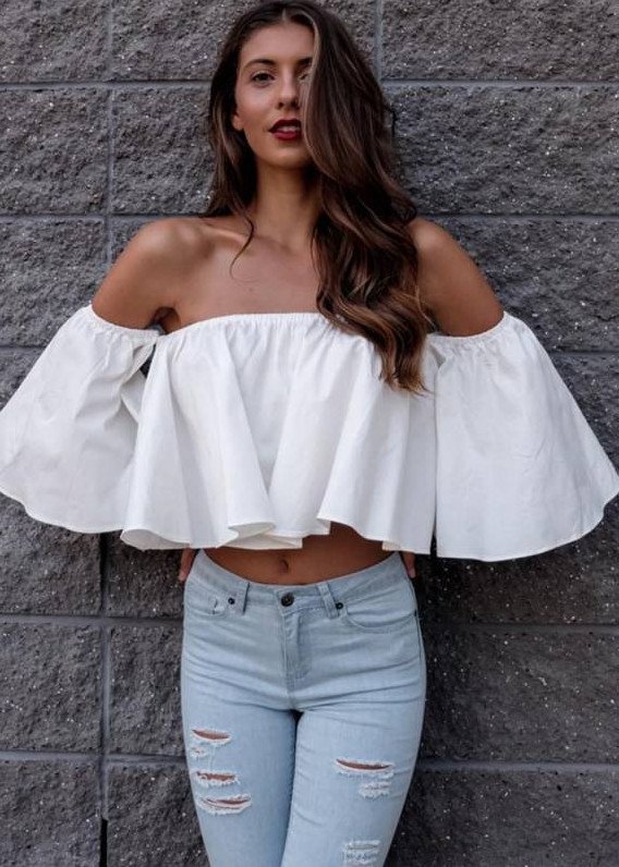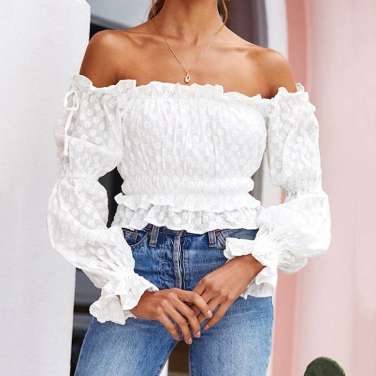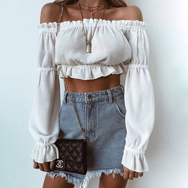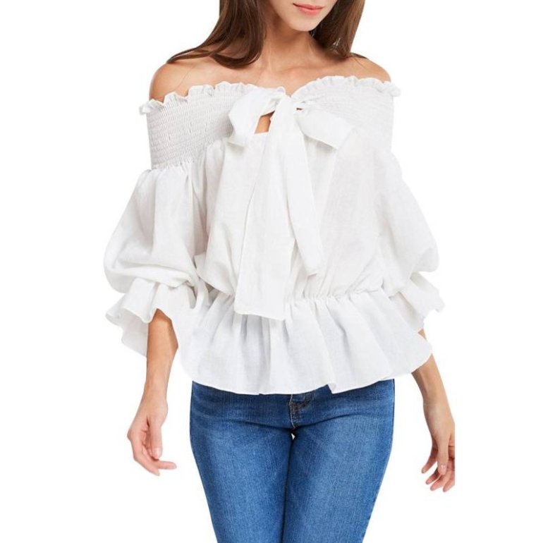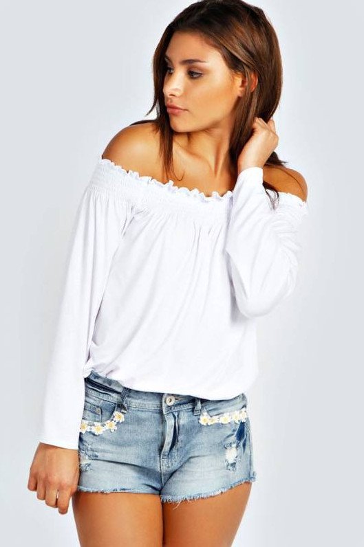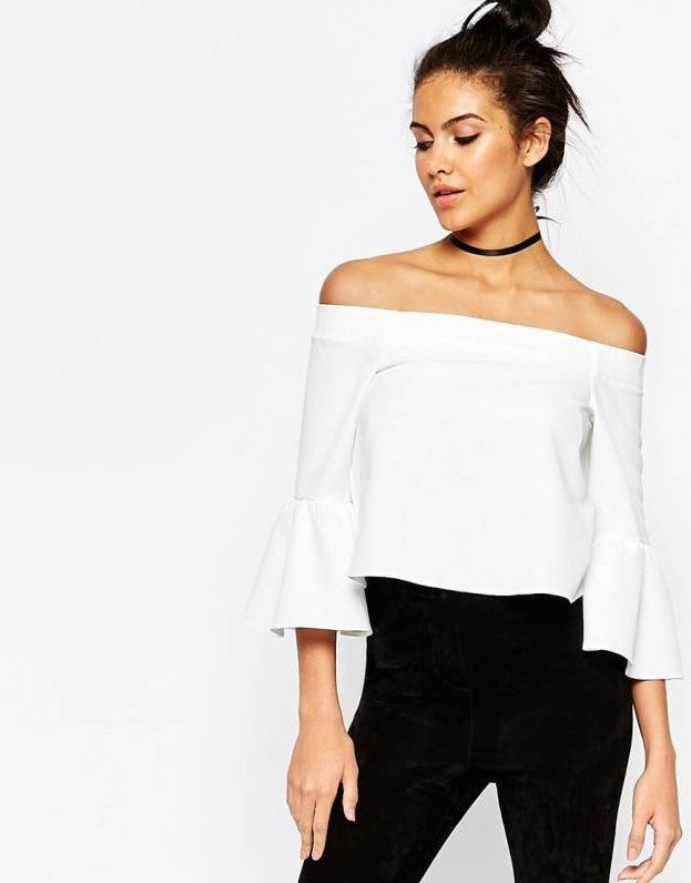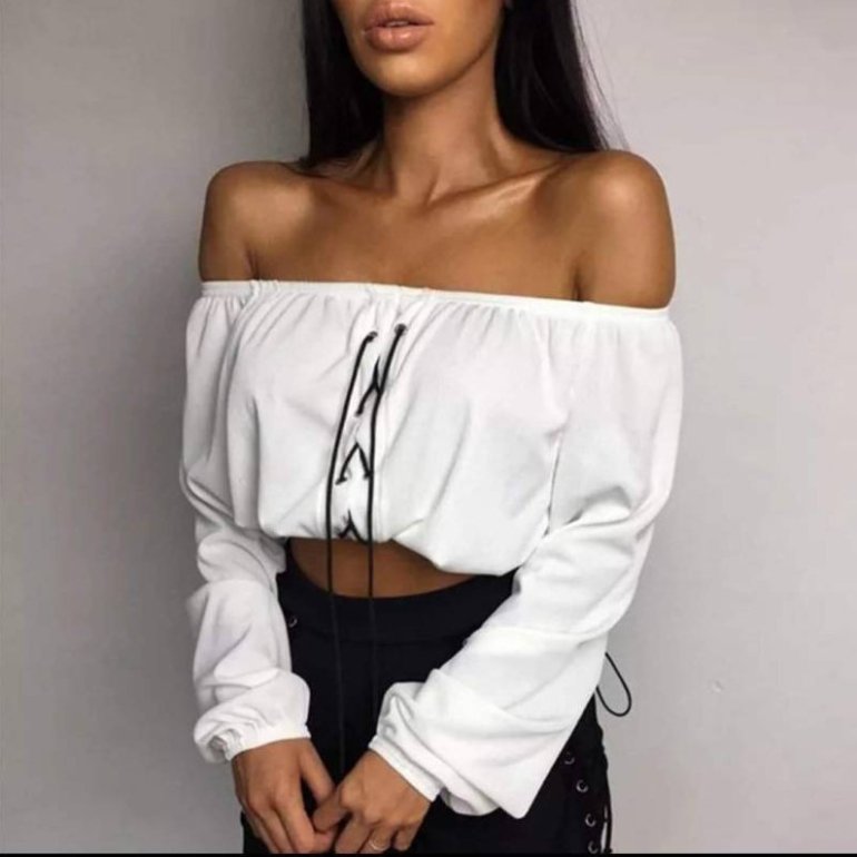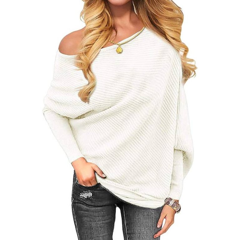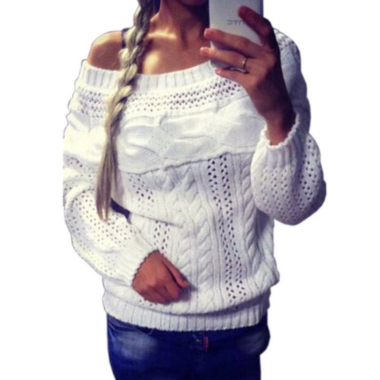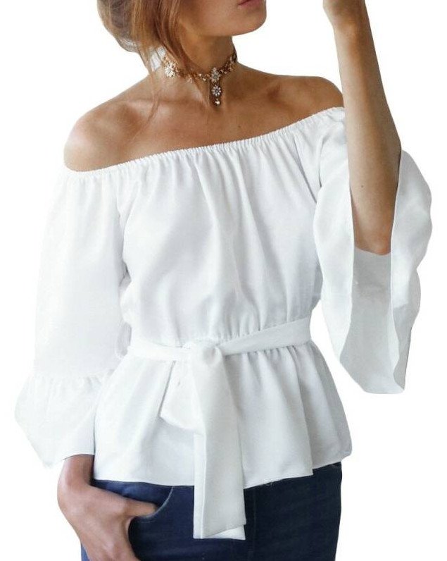 Кофта с открытыми плечами и длинноватыми рукавами.