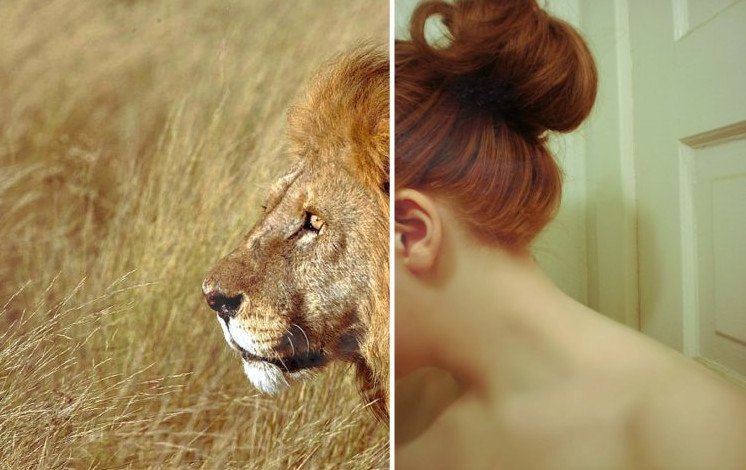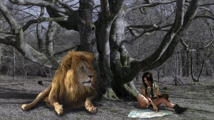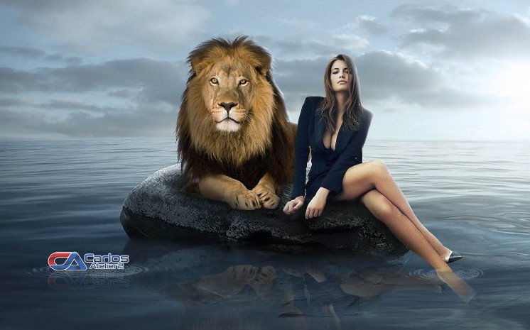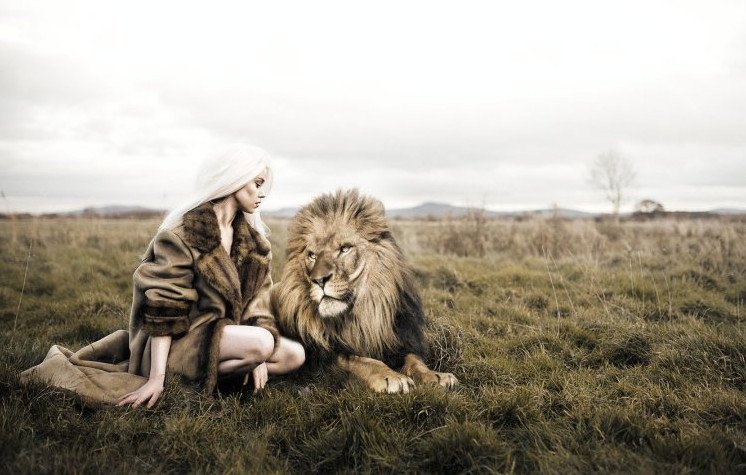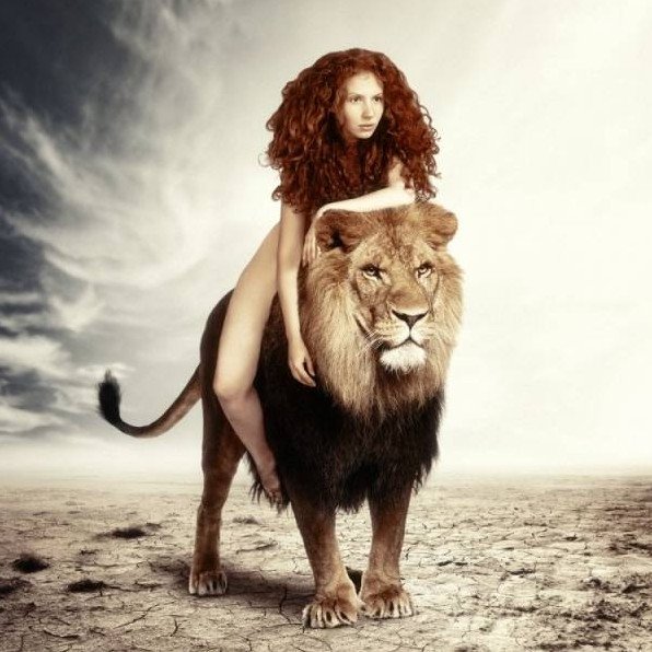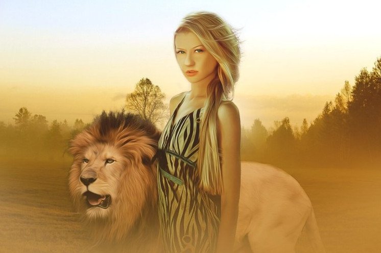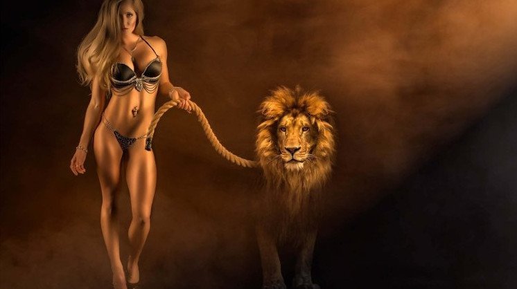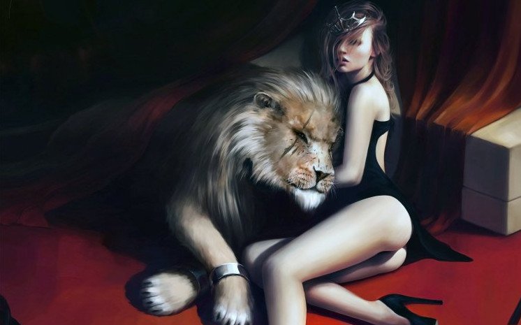 Красивая девушка и Лев.