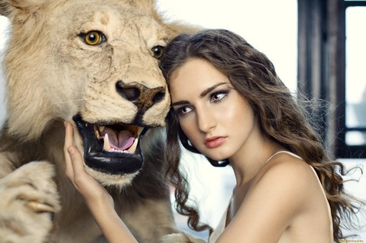 Красивая девушка и Лев картинки.