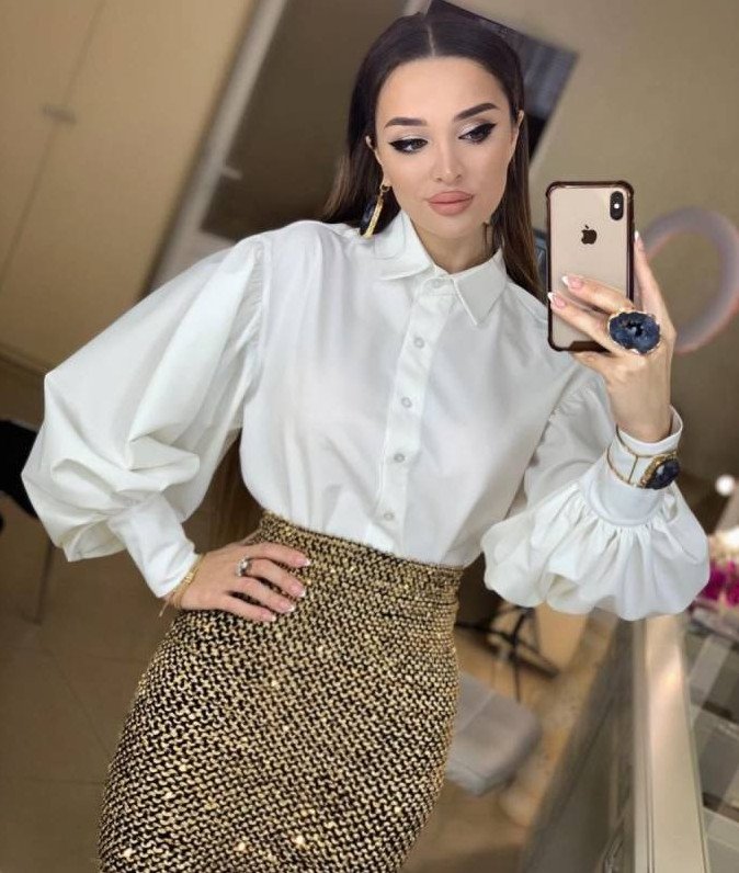 Белоснежная блузка с длинноватым рукавом.