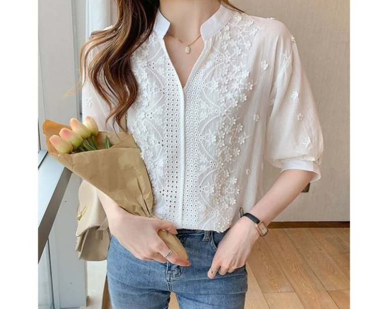 Белоснежная блузка с узорчатым воротником.