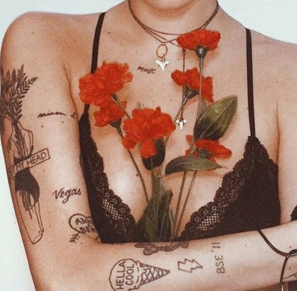 Тату роза на груди.