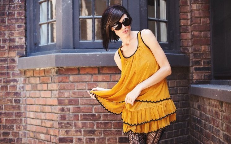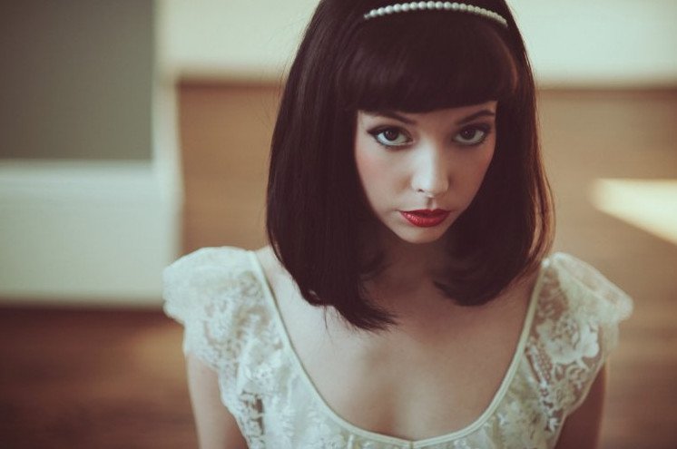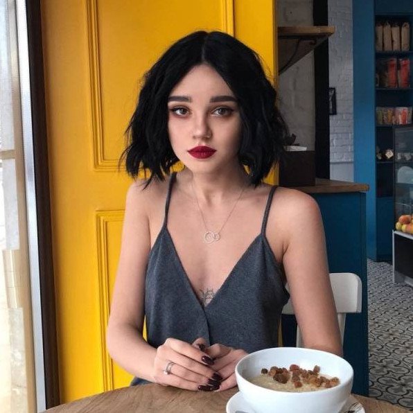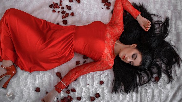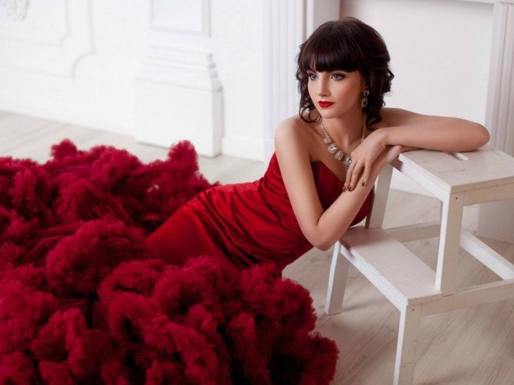 Эротика с брюнеткой с каре в Красноватом прекрасное платье.