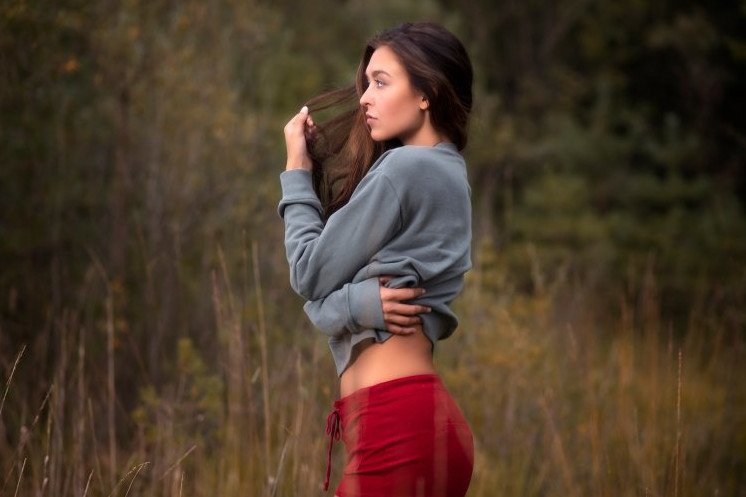 Красивая девушка в блузе боком.