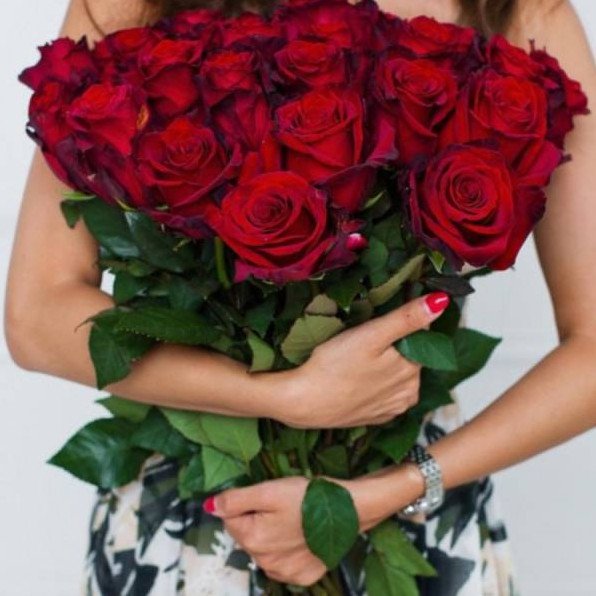 Девушка с букетом бардовых роз.
