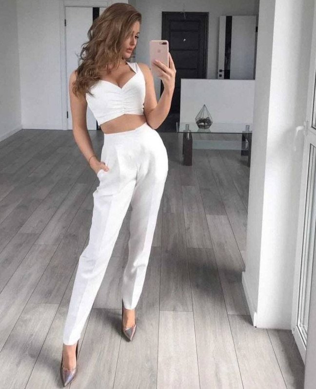 Девушка красавица в белоснежном костюмчике брючном.