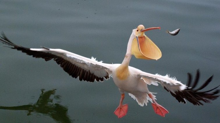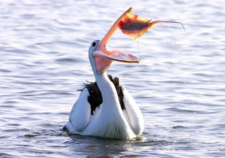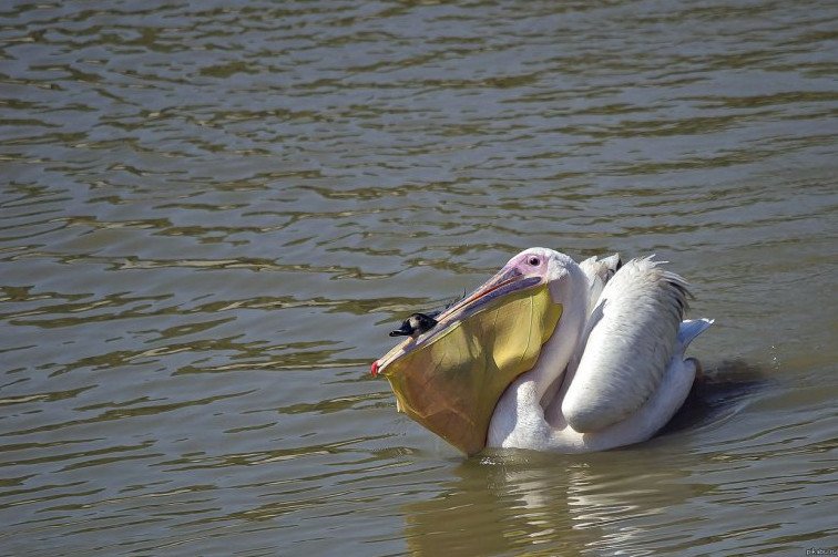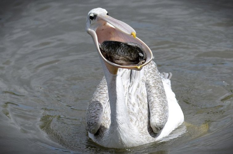 Пеликан питается рыбой.
