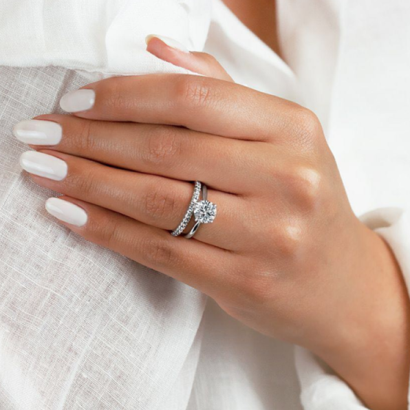 Обручальное и помолвочное кольцо на одном пальце.