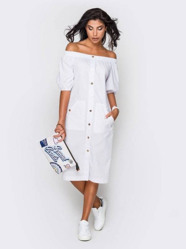 Платье рубаха с открытыми плечами.