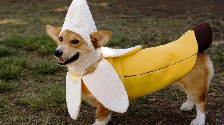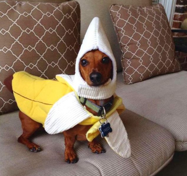 Собака в костюме банана.