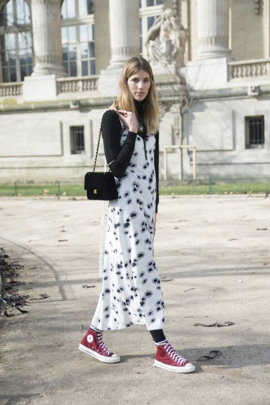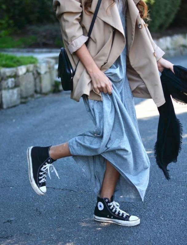Длинноватое платье с конверсами.