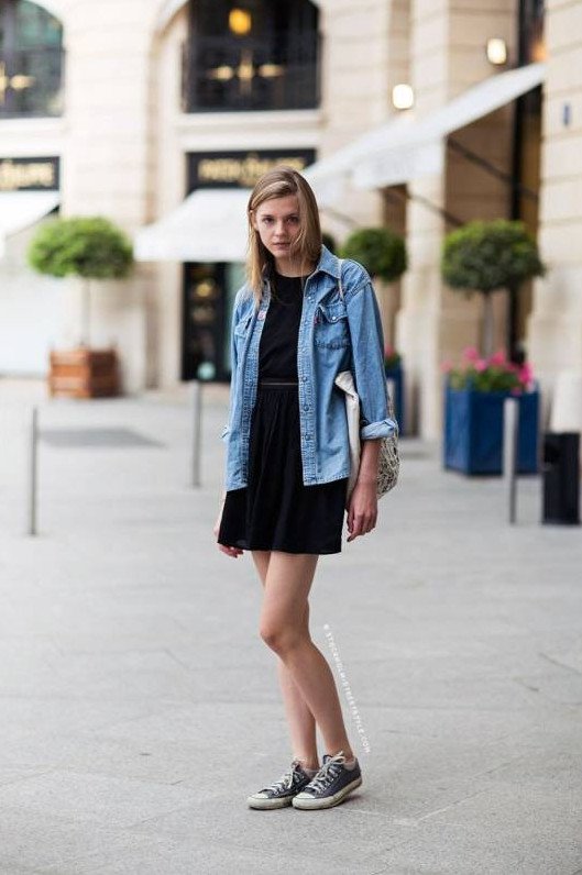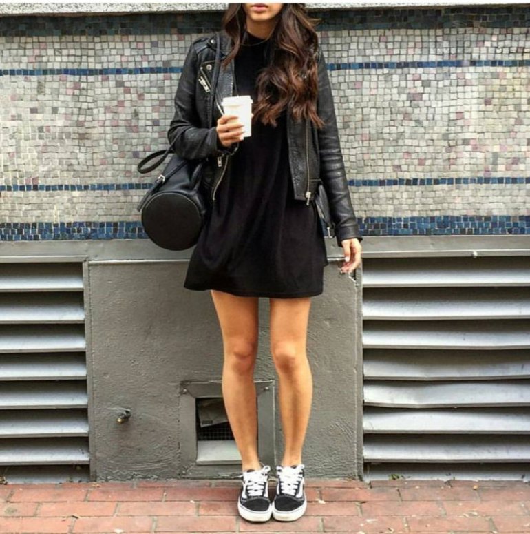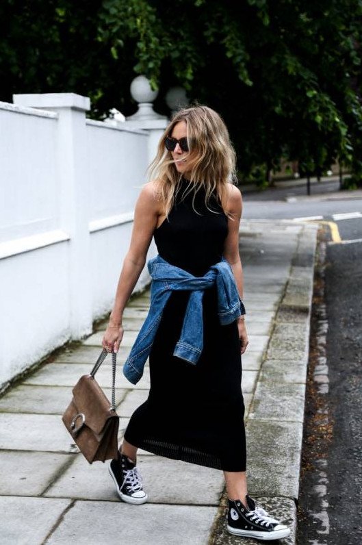 Темное платье с конверсами.