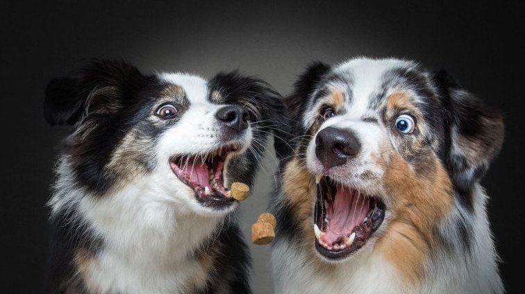 Собака ловит лакомство.