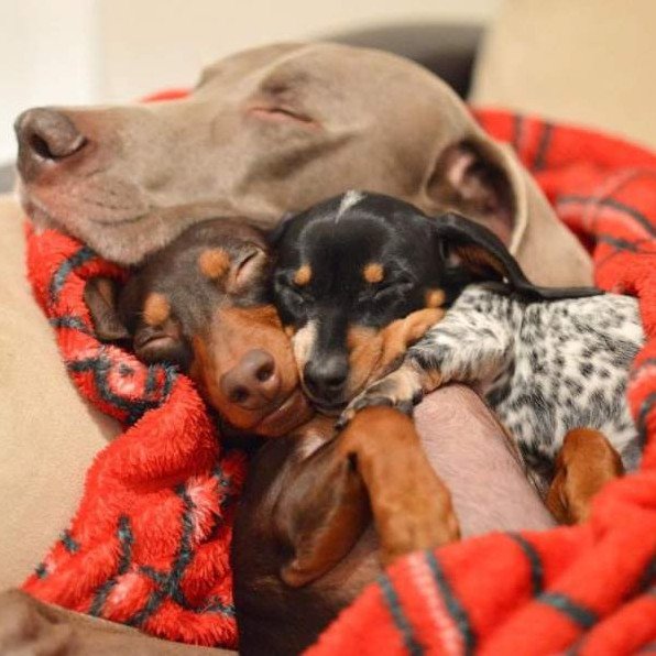 Собаки дремлют в обнимку.