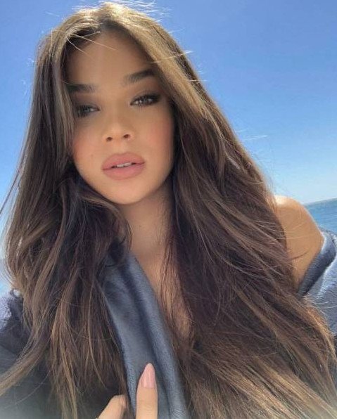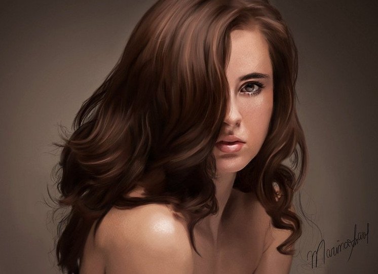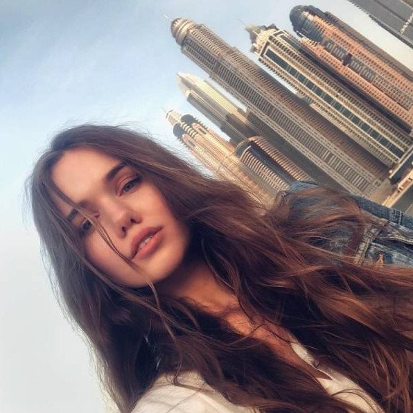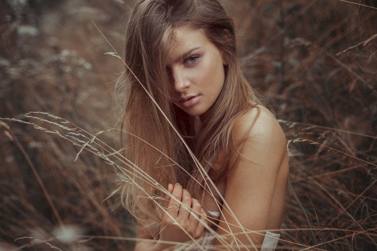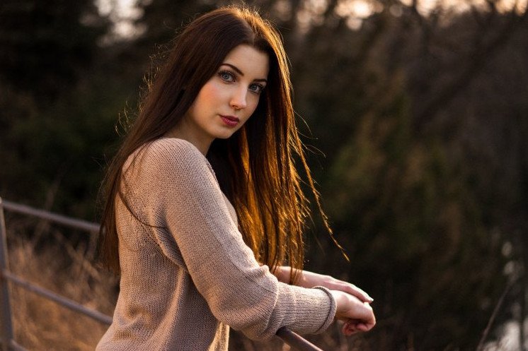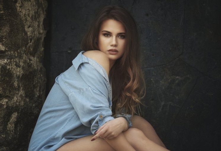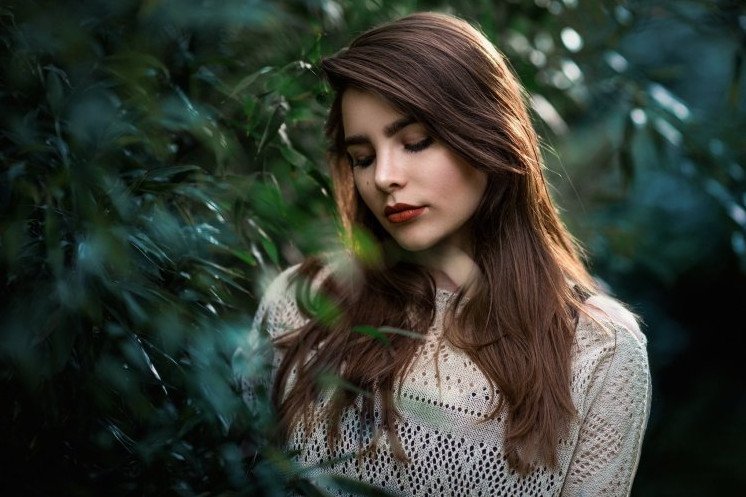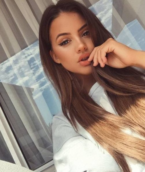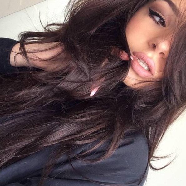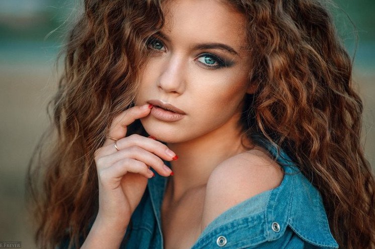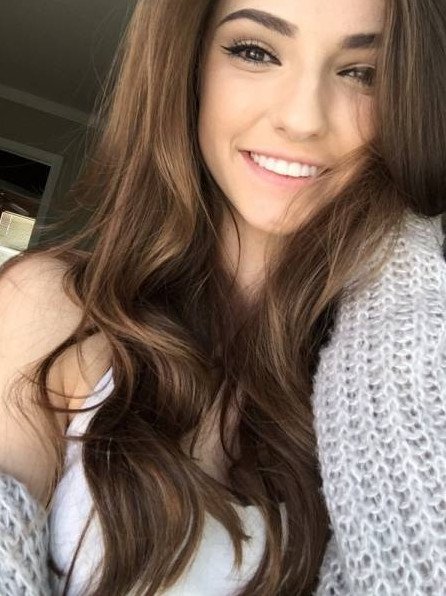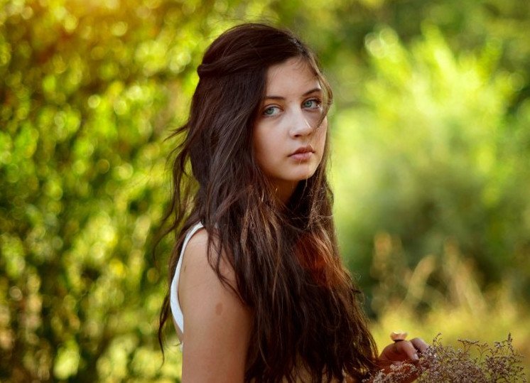 Красивая девушка с каштановыми волосами и голубыми глазами.