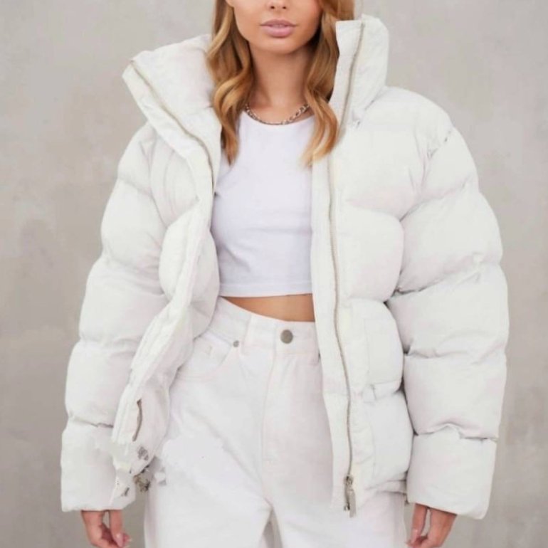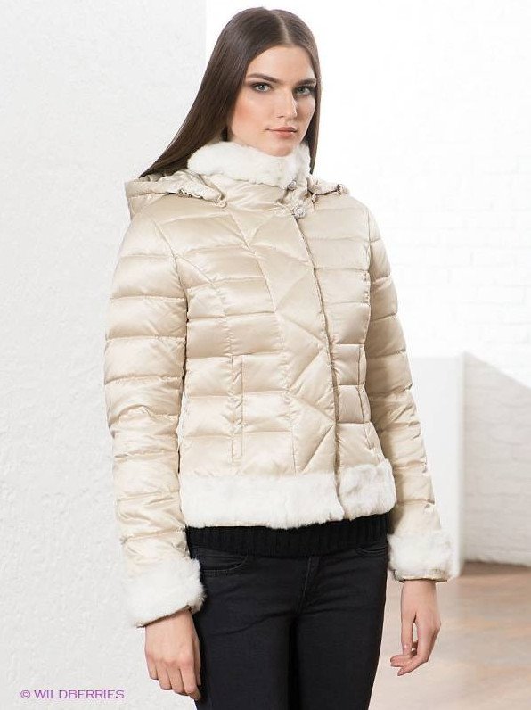Бежевый укороченный пуховик.