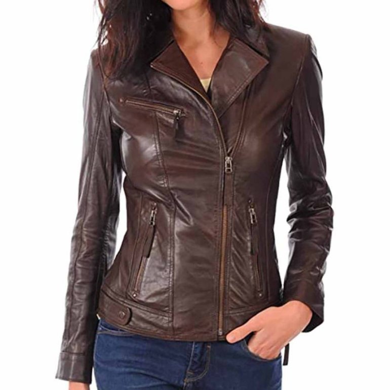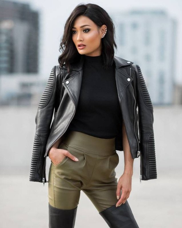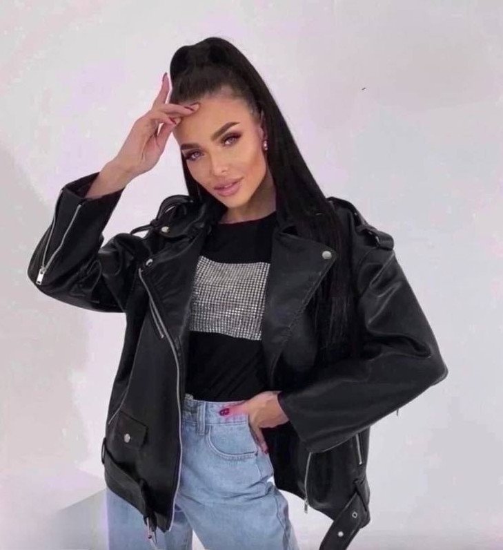 Красивая женщина в кожаной куртке.