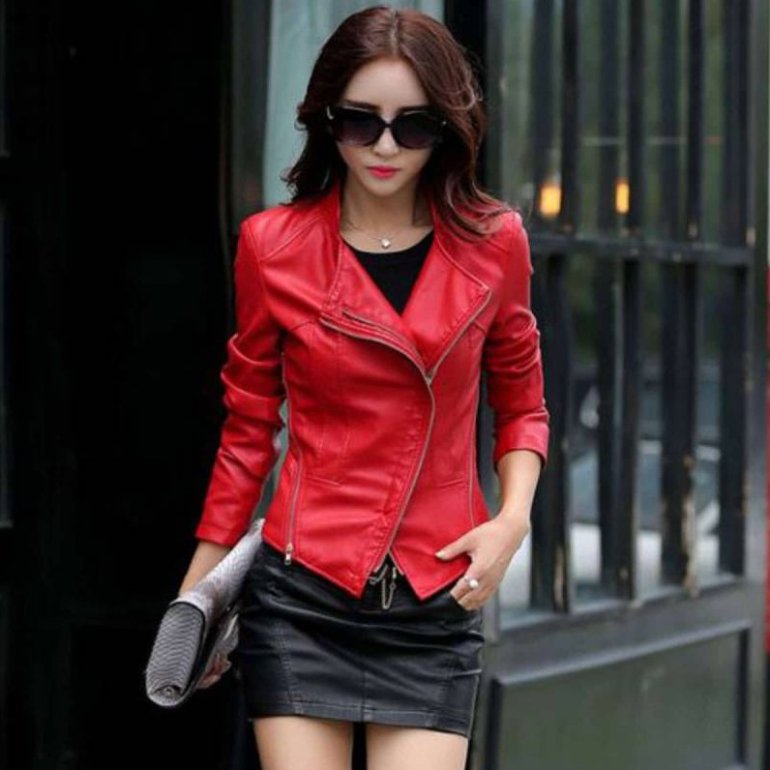 Очень красная кожаная куртка женская.