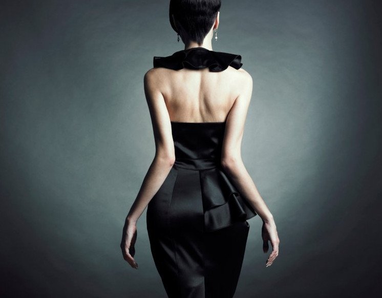 Красивая девушка в обтягивающем прекрасное платье со спины.