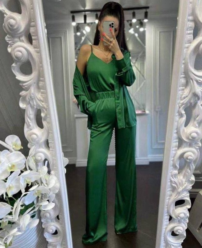 12 Сторис шелковый зеленоватый костюмчик.