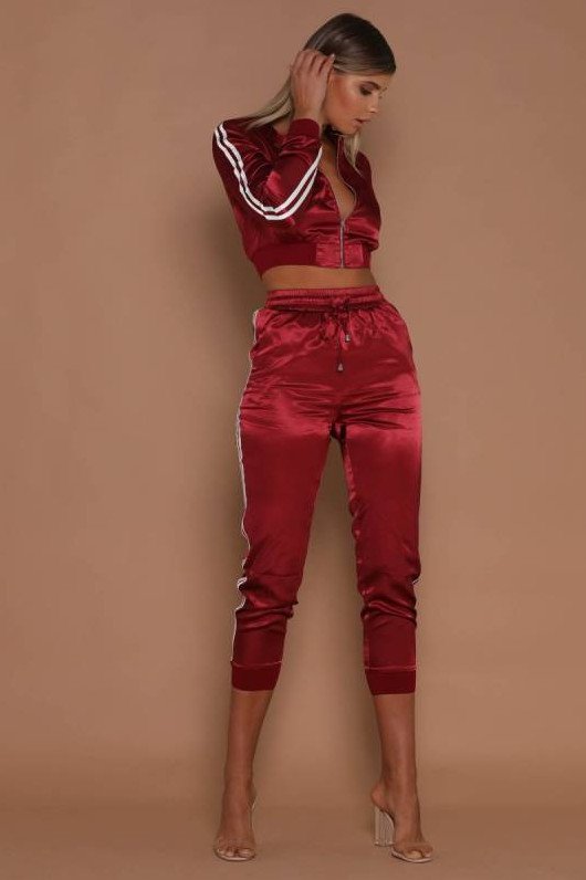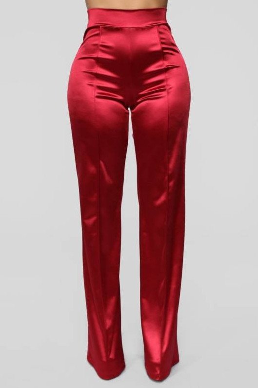 Очень красные атласные штаны.