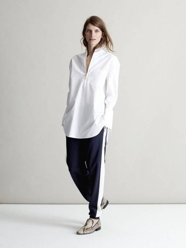 Белоснежная рубаха и спортивные штаны.