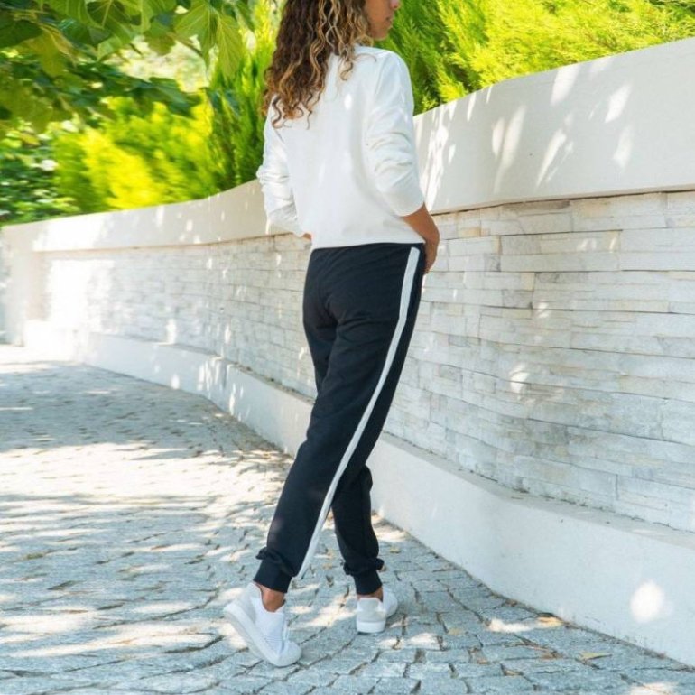 Темные штаны с белоснежными лампасами.