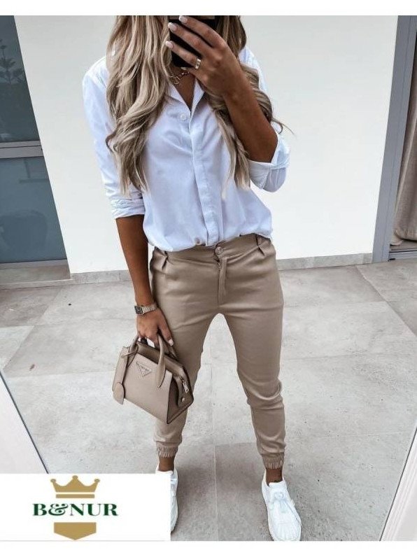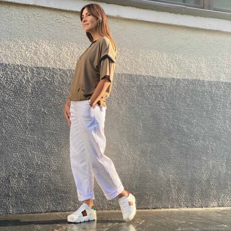 Оюоащ с бежевыми брюками.